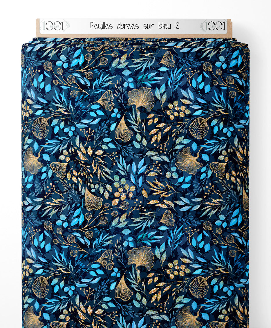 Tissu - Feuilles dorées sur bleu 2