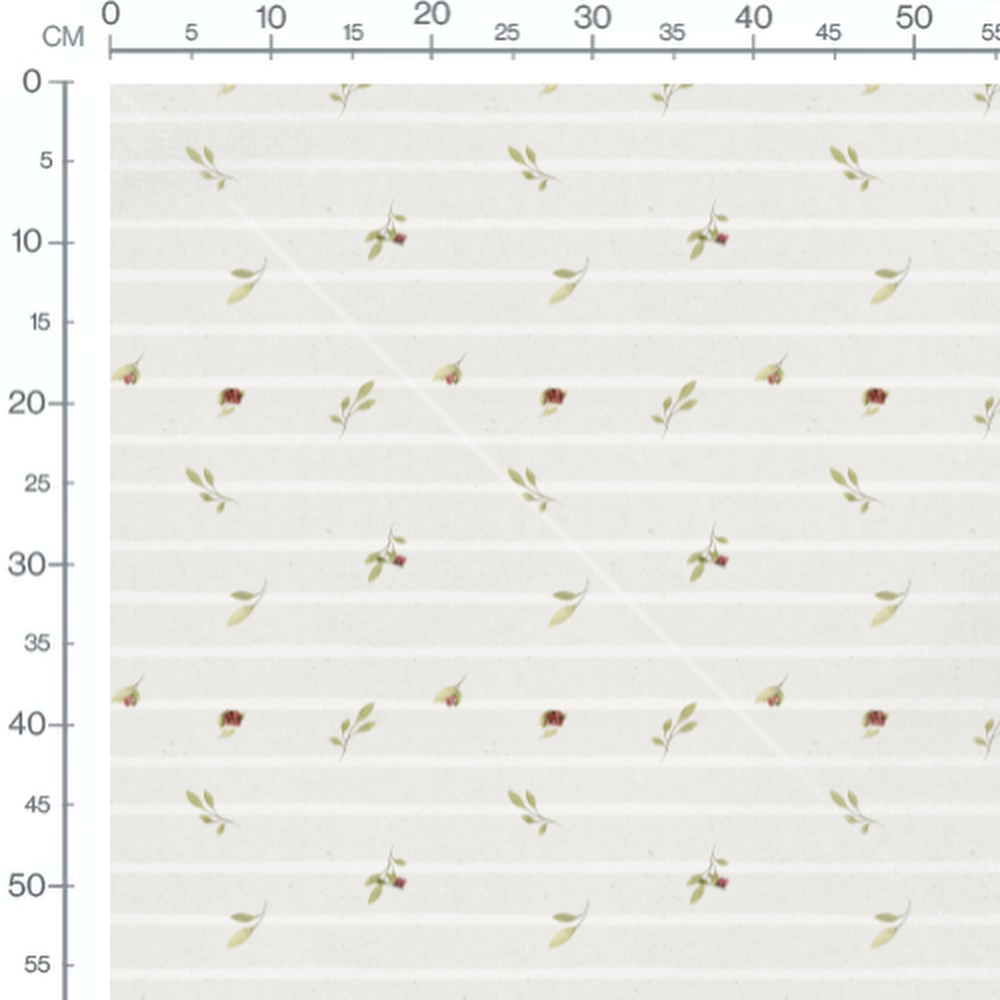 Les branches sont parsemées de petites feuilles vertes et de baies rouges. Le fond est composé de rayures horizontales blanches et gris clair, ajoutant une touche subtile au motif.Les tissus