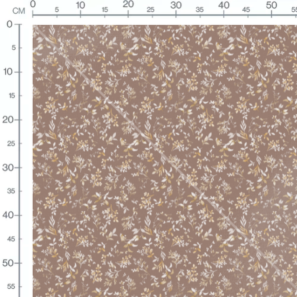 Les motifs incluent des feuilles et des brindilles de différentes formes. Les couleurs varient entre le beige clair et le doré, créant un effet élégant sur le fond brun.Les tissus