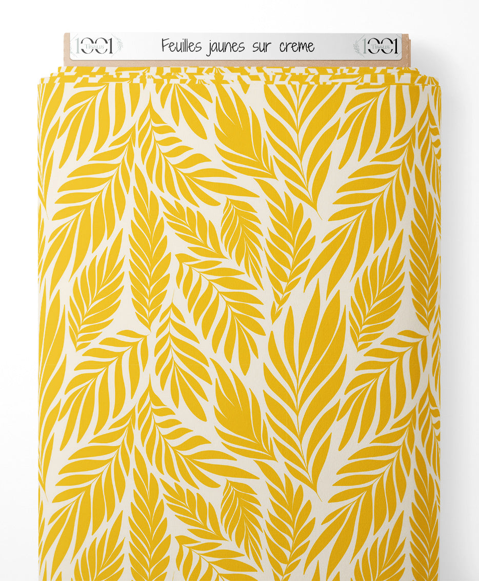 Les feuilles sont stylisées et de couleur jaune vif. Le fond crème met en valeur le motif tropical. Les feuilles varient en taille et en orientation.Les tissus