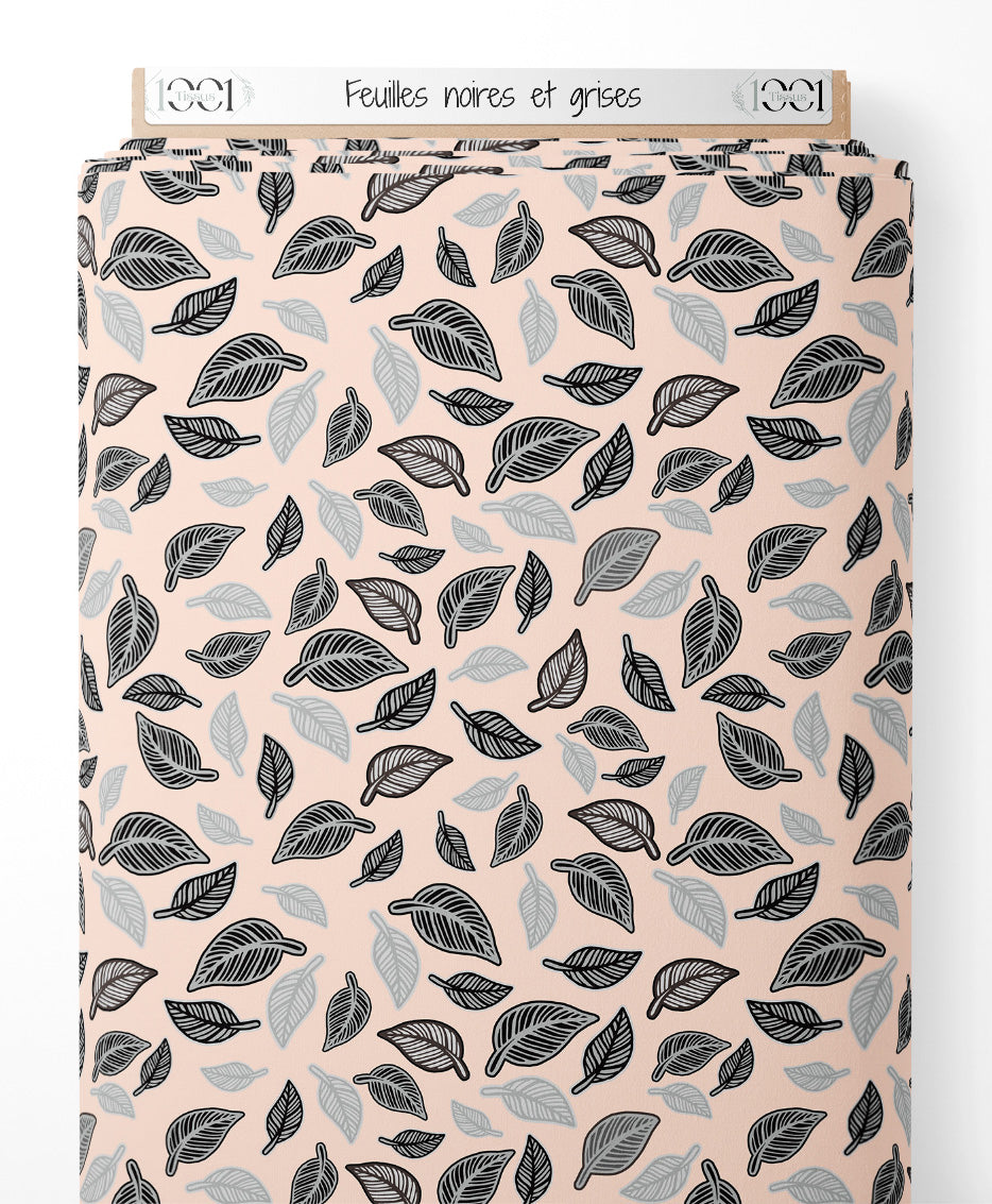 Les feuilles sont de différentes tailles et orientations. Le fond beige met en valeur les nuances sombres des feuilles. Les motifs de feuilles sont dessinés avec des lignes fines et élégantes.Les tissus