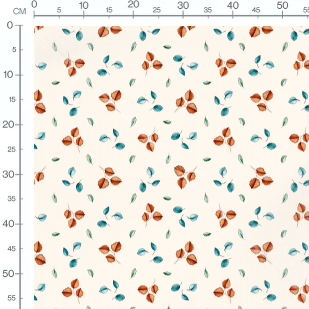 Les feuilles orange sont regroupées par trois. Les feuilles bleues sont isolées et arrondies. Les petites feuilles vertes sont allongées et éparpillées.Les tissus