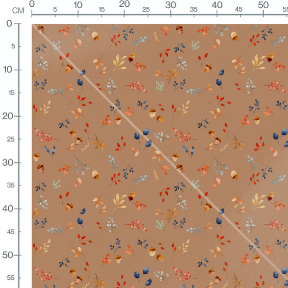 Les feuilles sont de différentes formes et couleurs, allant du rouge au bleu. Les glands ajoutent une touche automnale au motif.Les tissus