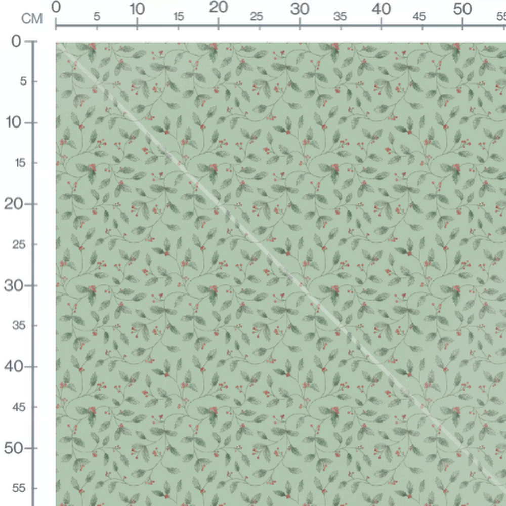 Les feuilles sont finement dessinées avec des nuances de vert. Les baies rouges ajoutent une touche de couleur vive au motif. Les branches s'entrelacent harmonieusement sur le fond vert clair.Les tissus