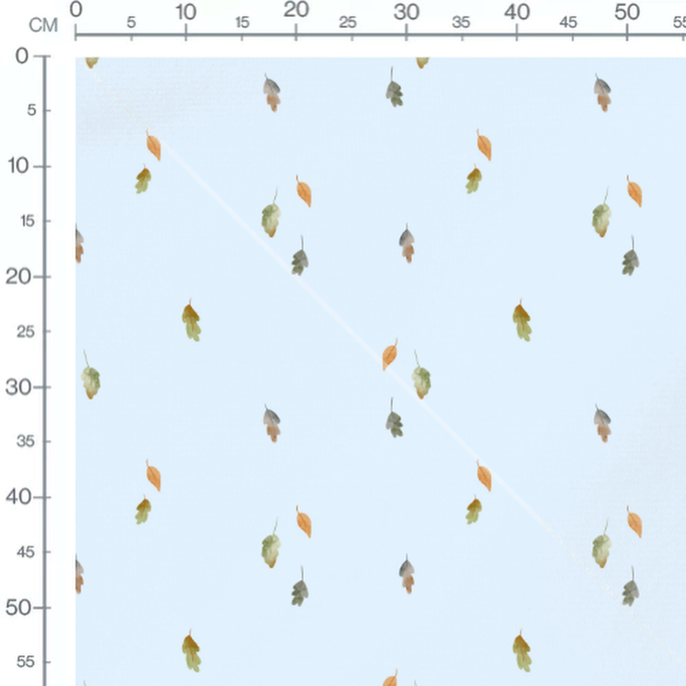 Les feuilles sont délicatement peintes à l'aquarelle, offrant une palette de couleurs naturelles. Les nuances de vert, orange, gris et marron se détachent subtilement sur le fond bleu clair. Chaque feuille présente une forme unique, ajoutant de la variété au motif.Les tissus
