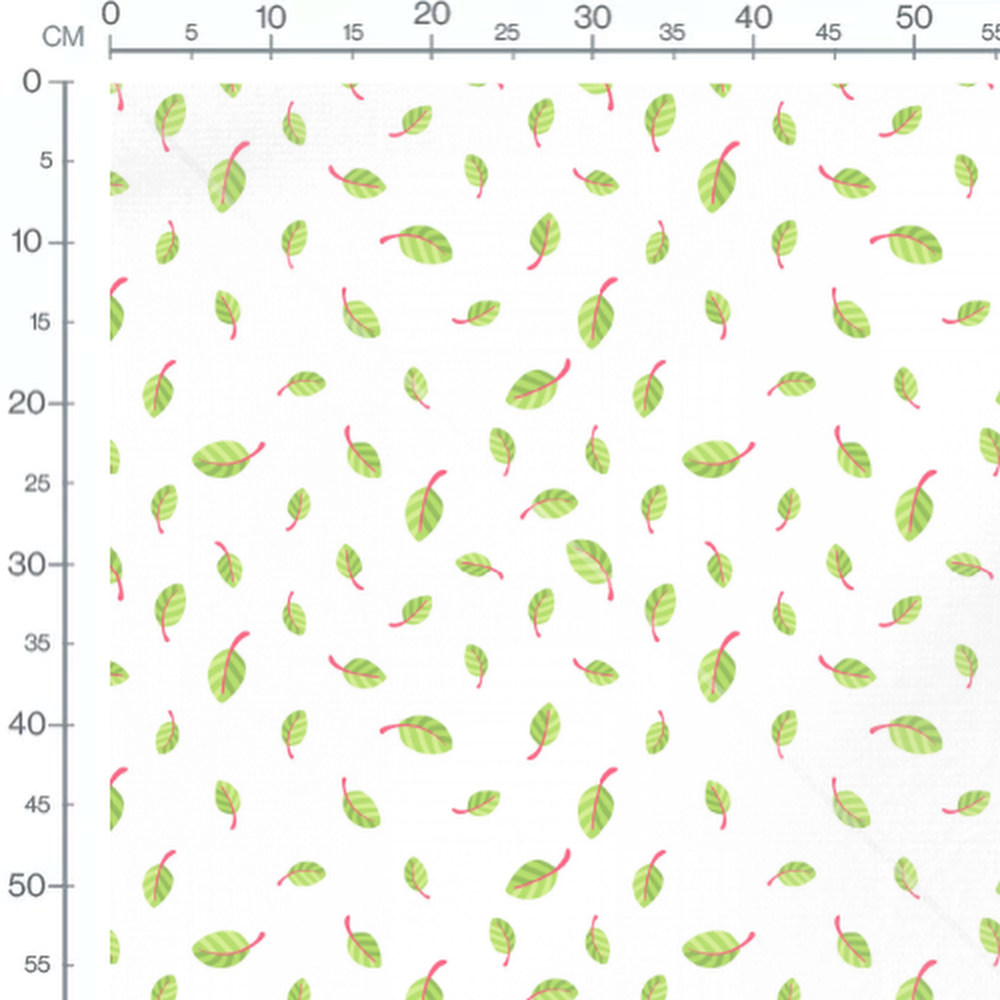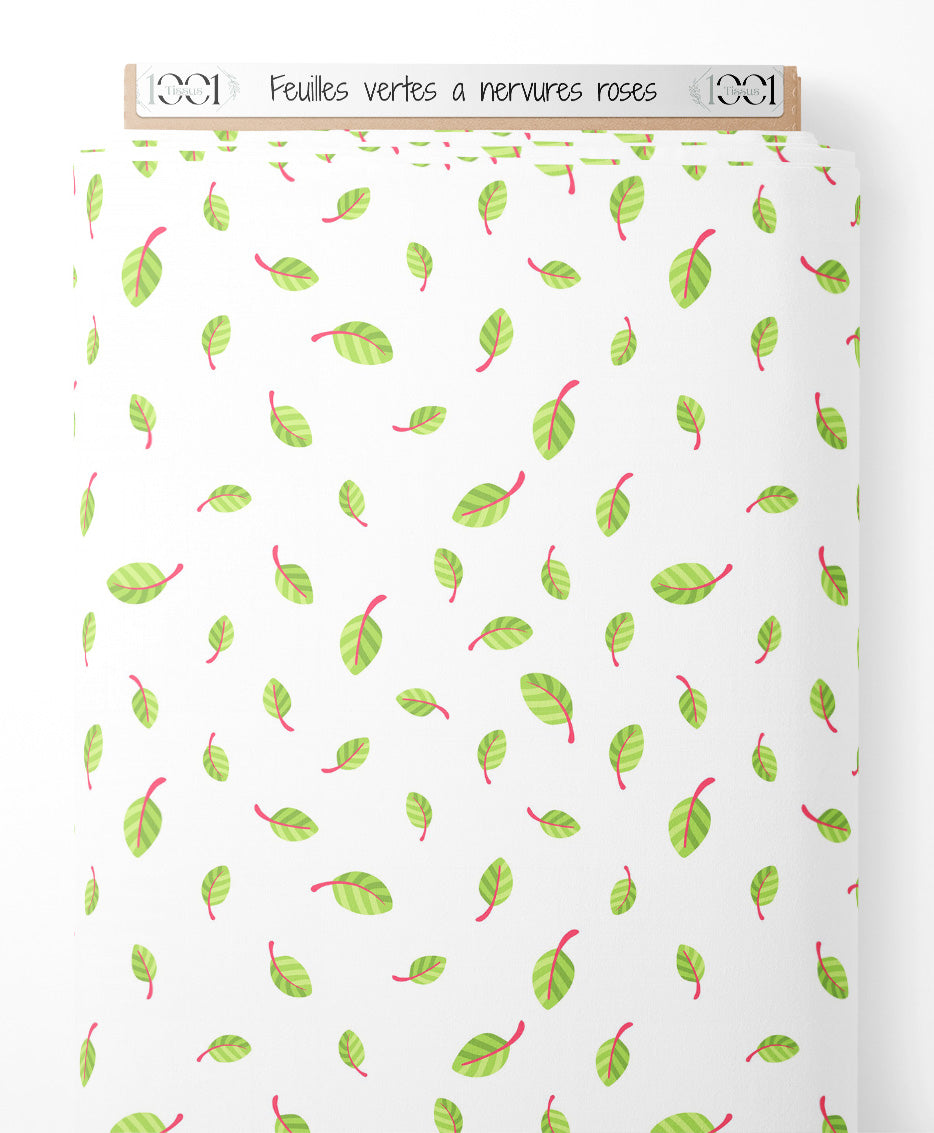 Les feuilles sont de différentes tailles et présentent des nervures roses distinctes. Le fond blanc met en valeur les couleurs vives des feuilles. Les nuances de vert varient légèrement entre les feuilles.Les tissus