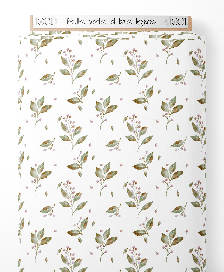 Les feuilles sont peintes dans des tons verts doux avec des nuances brunes. Les baies sont d'un rose pâle, ajoutant une touche de couleur subtile. Le motif est espacé, créant une impression de légèreté et de fraîcheur.Les tissus