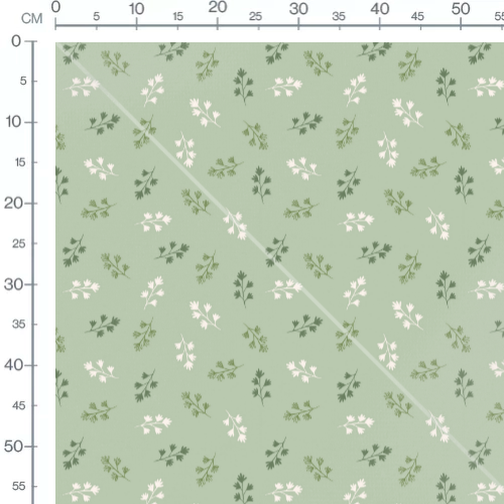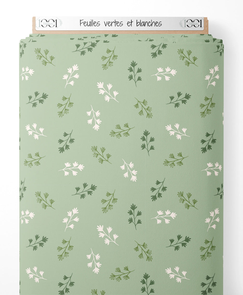 Les feuilles sont de différentes nuances de vert et de blanc. Le fond vert clair met en valeur le motif naturel. Les feuilles sont disposées de manière aléatoire, créant un effet harmonieux. Chaque feuille présente des détails fins et variés.Les tissus