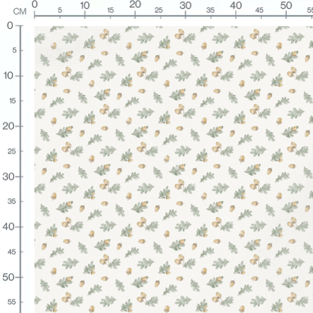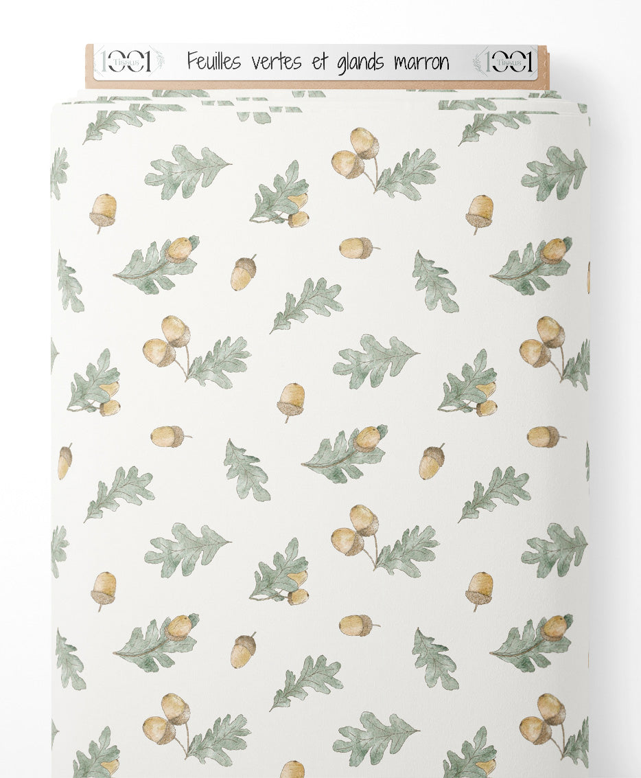 Les feuilles sont dessinées dans des tons de vert doux. Les glands sont de couleur marron clair, apportant une touche automnale.Les tissus