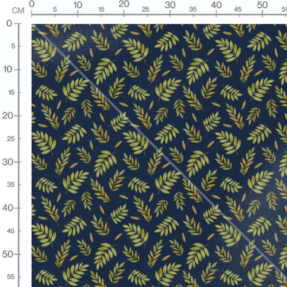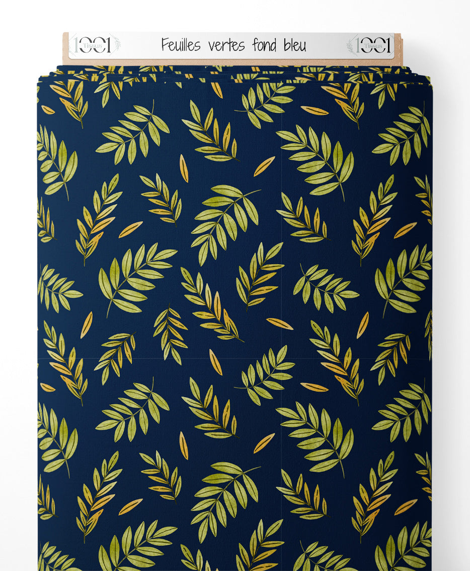 Les feuilles sont disposées de manière aléatoire, créant un motif riche et varié. Les nuances de vert et de jaune ajoutent de la profondeur au design. Le fond bleu foncé met en valeur les couleurs vives des feuilles.Les tissus