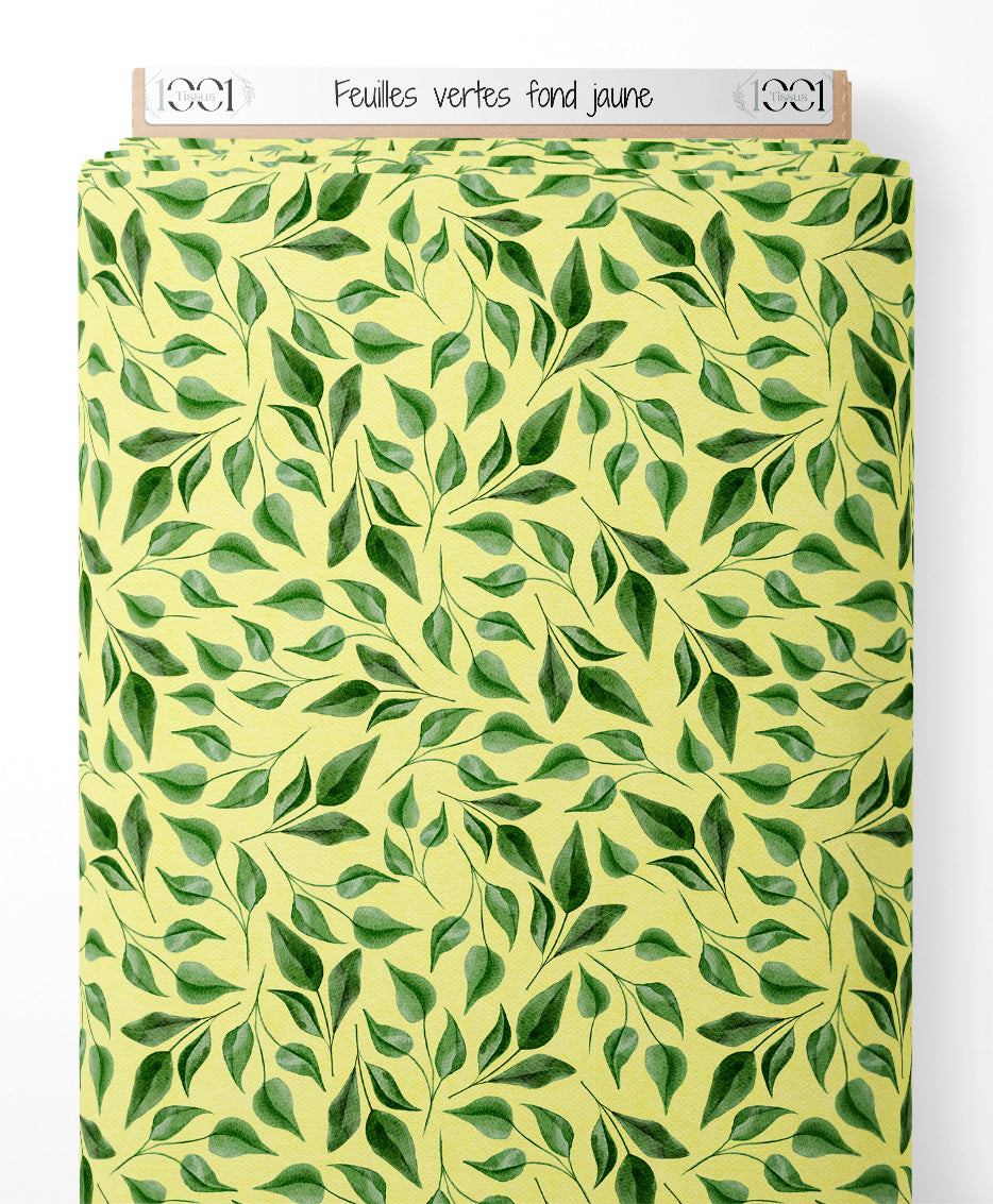 Tissu - Feuilles vertes sur fond jaune