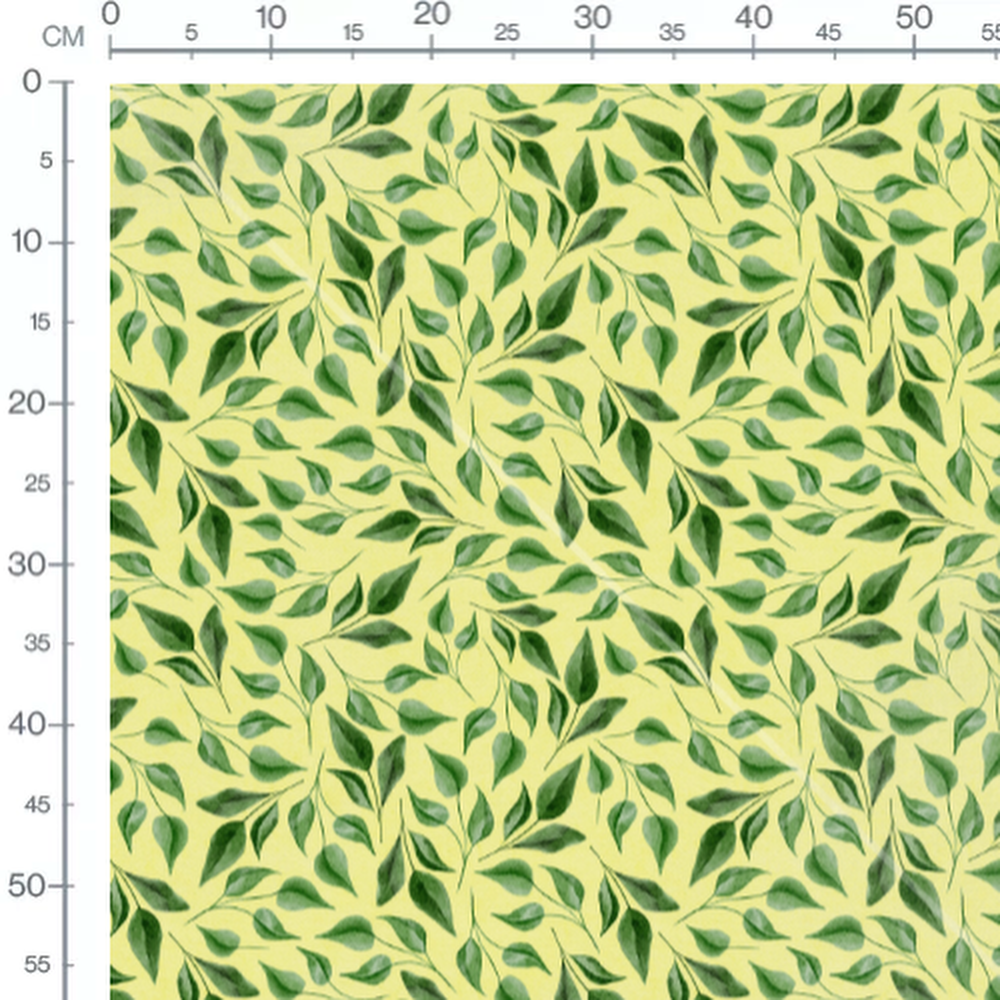Les feuilles sont disposées de manière aléatoire, créant un motif dense. Les nuances de vert varient du clair au foncé, ajoutant de la profondeur. Le fond jaune clair contraste avec les feuilles, mettant en valeur leur couleur.Les tissus