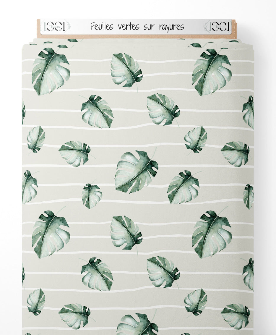 Les feuilles sont de différentes tailles et présentent des nuances de vert. Les rayures blanches et grises ajoutent un contraste subtil au motif tropical.Les tissus