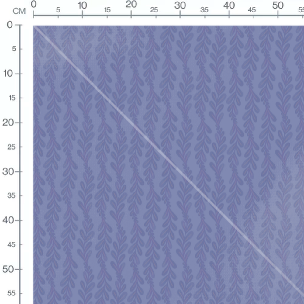 Les feuilles sont disposées verticalement et sont de différentes nuances de violet. Le fond bleu met en valeur les motifs de feuillage.Les tissus