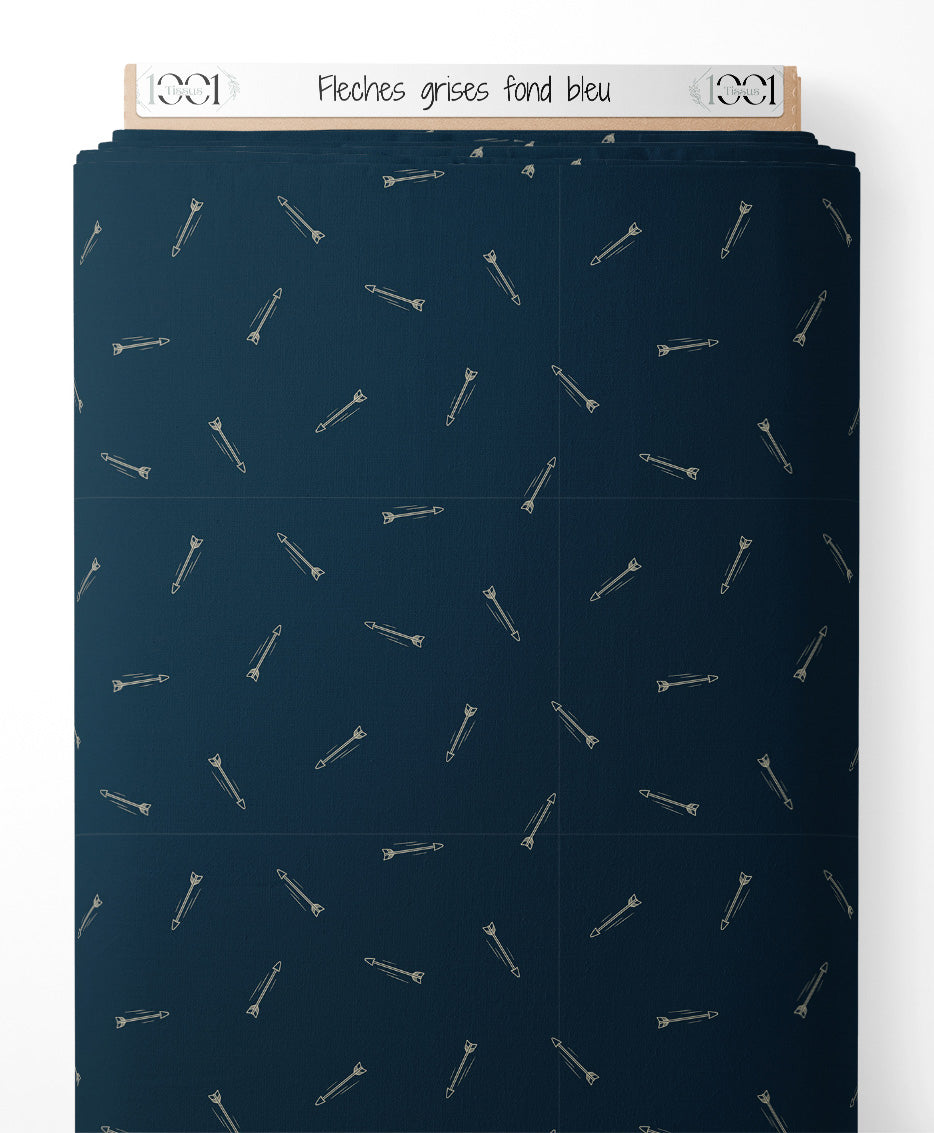 Les flèches sont dessinées avec des lignes simples et épurées. Le fond bleu foncé met en valeur les flèches grises. Chaque flèche est orientée dans une direction différente, créant un motif dynamique.Les tissus