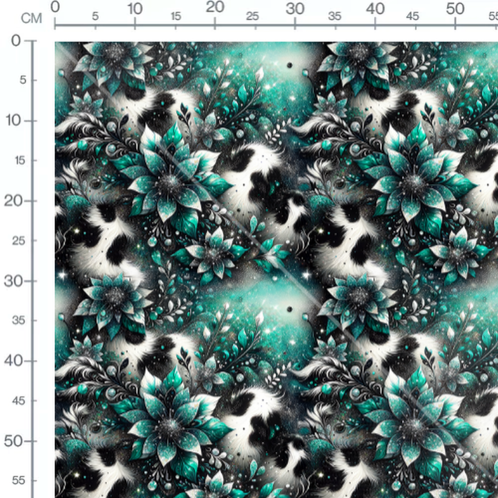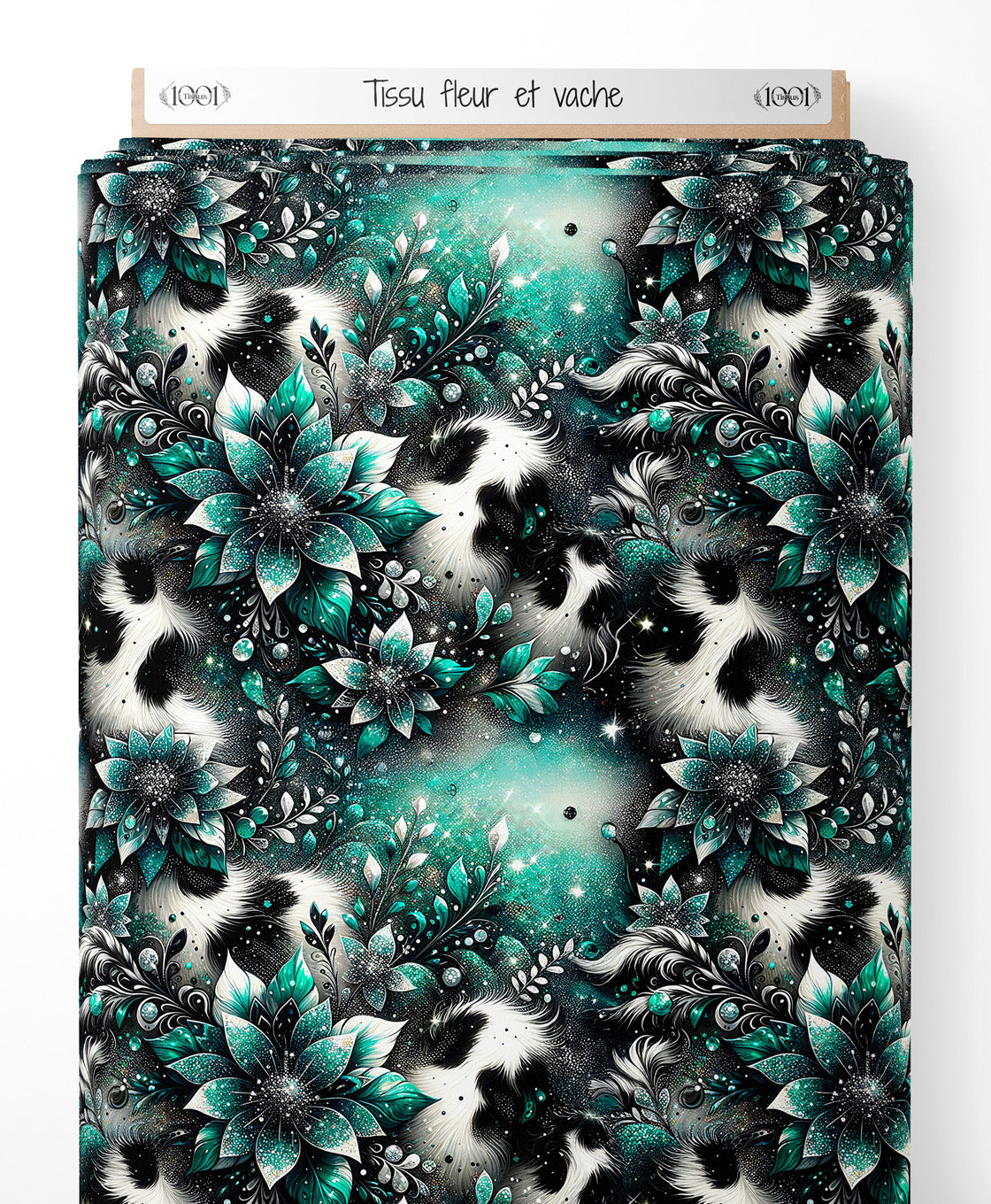 Fleurs et vaches noires et blanches sur fond vert et noir. Les tissus