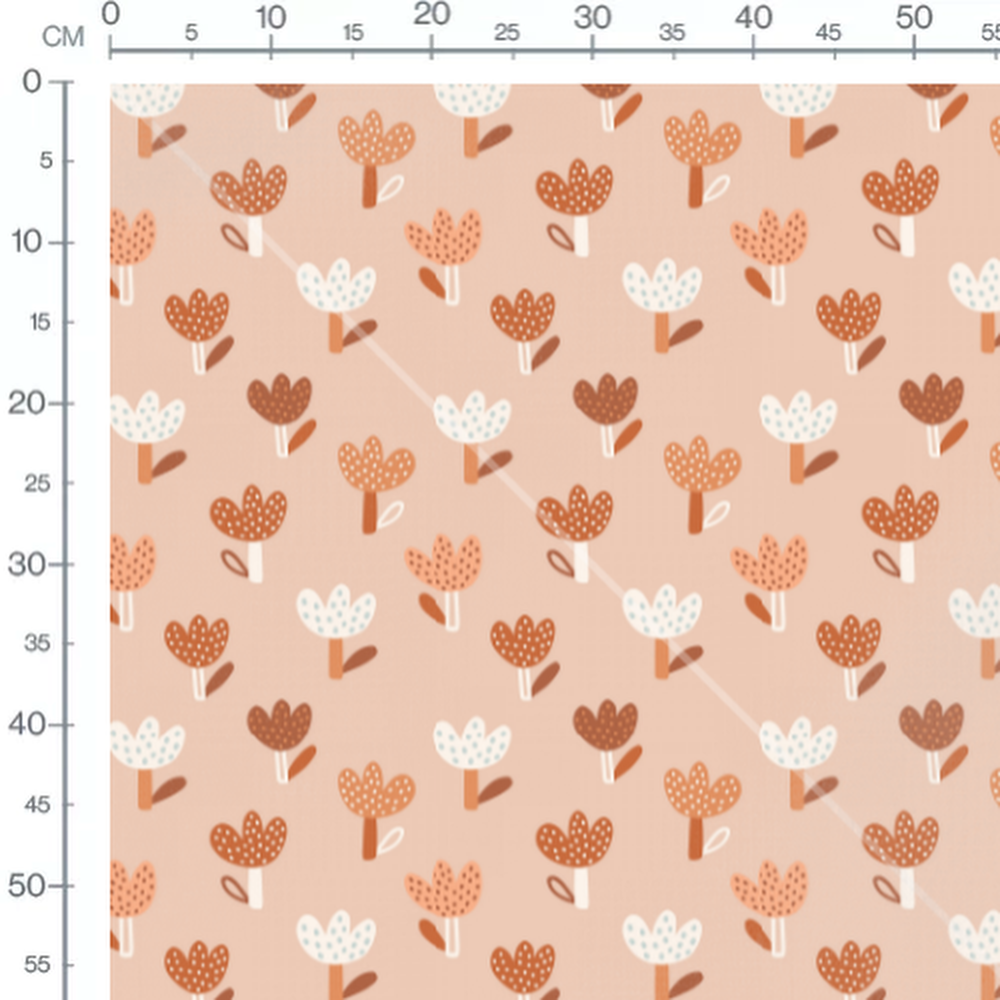 Les fleurs marron ont des pois blancs, tandis que les fleurs blanches ont des pois bleus. Les tiges sont de différentes nuances de marron, ajoutant de la variété au motif.Les tissus