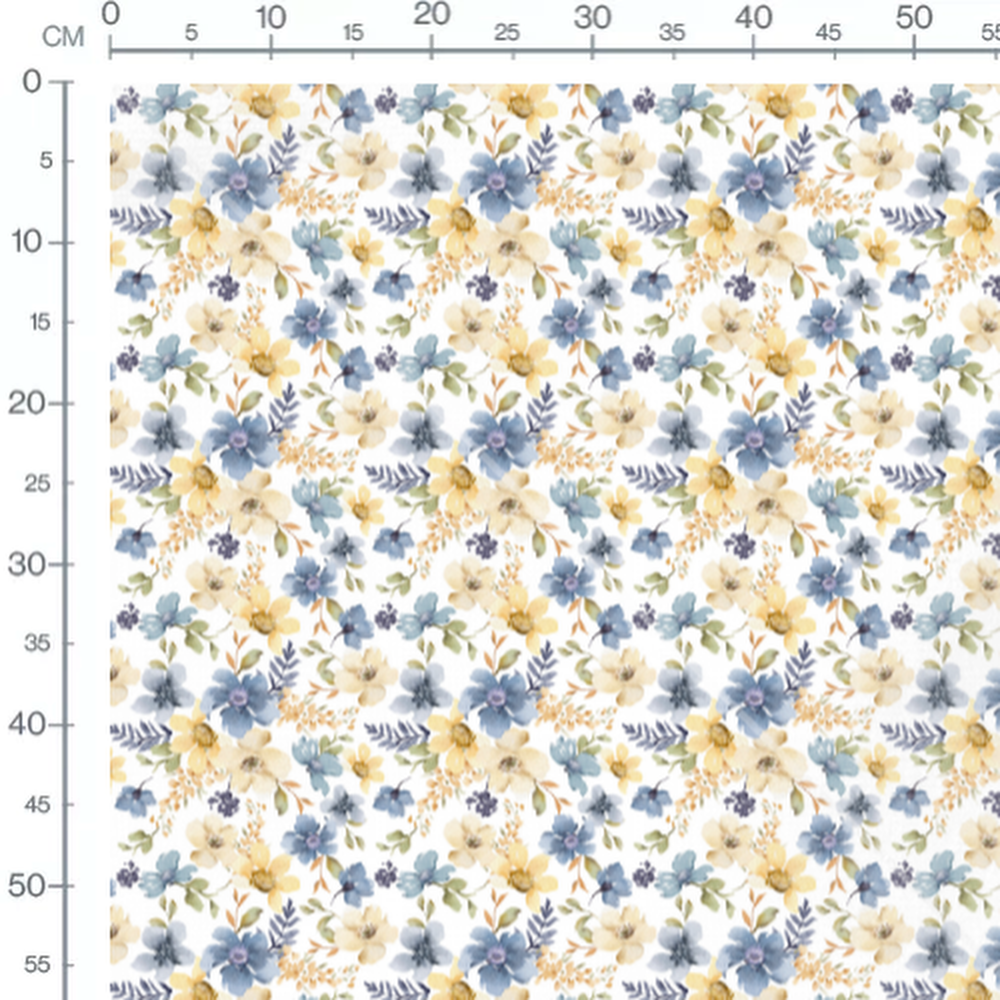 Les fleurs sont de différentes tailles et nuances de bleu et de jaune. Les feuilles varient entre le vert et le brun, ajoutant de la diversité au motif. Quelques petites fleurs violettes complètent l'ensemble floral.Les tissus