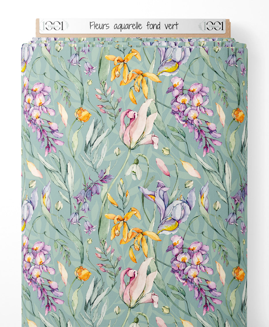Les fleurs sont délicatement peintes avec des nuances de rose, orange et violet. Le fond vert ajoute une touche de fraîcheur au motif floral. Les détails des feuilles et des pétales sont finement réalisés.Les tissus