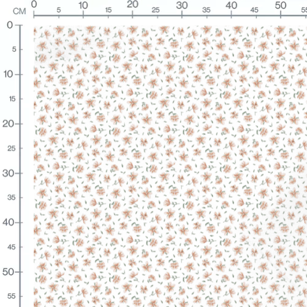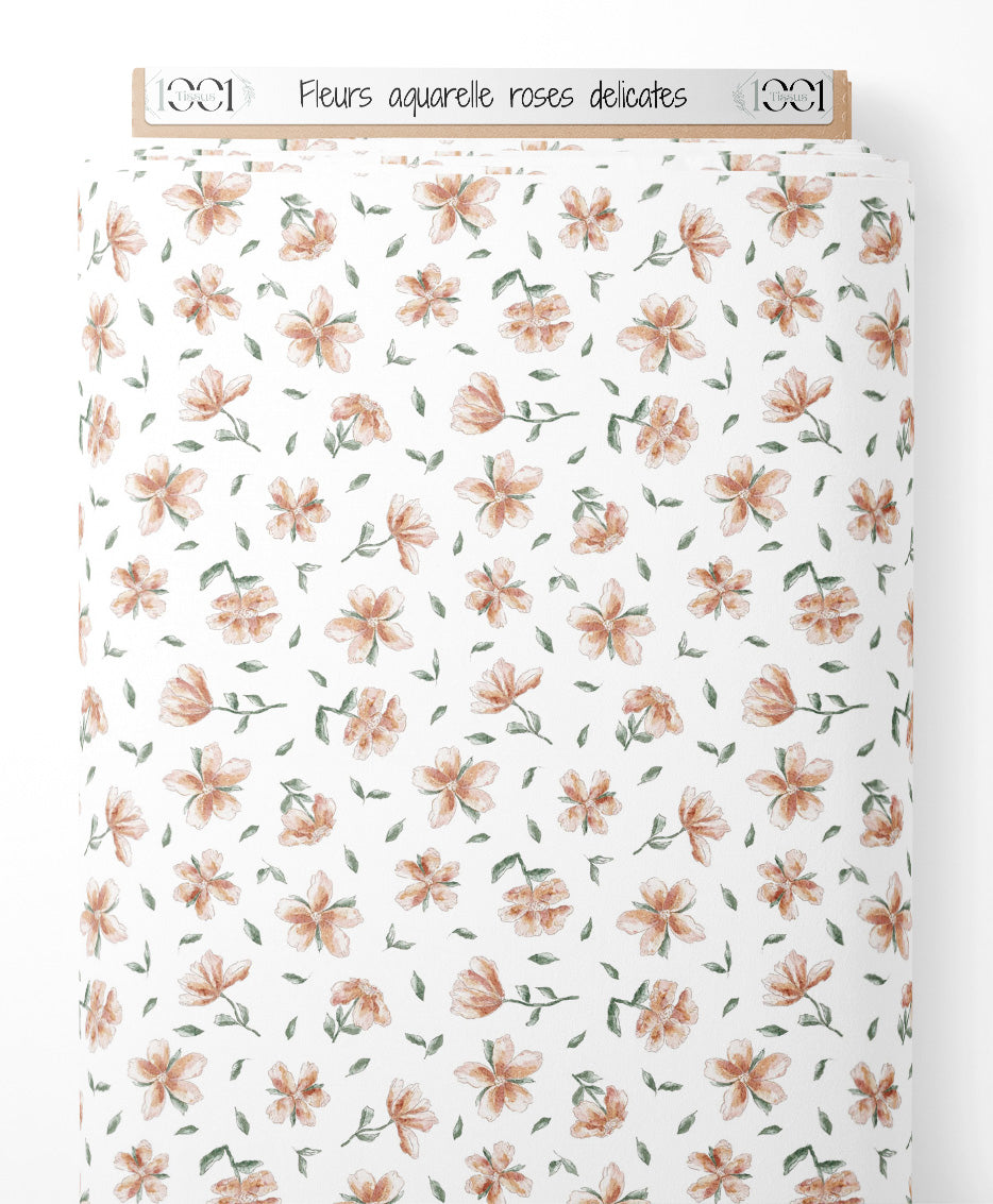 Les fleurs sont de différentes tailles avec des nuances de rose doux. Les feuilles vertes ajoutent un contraste subtil au motif floral. Le fond blanc met en valeur la délicatesse des fleurs et des feuilles.Les tissus