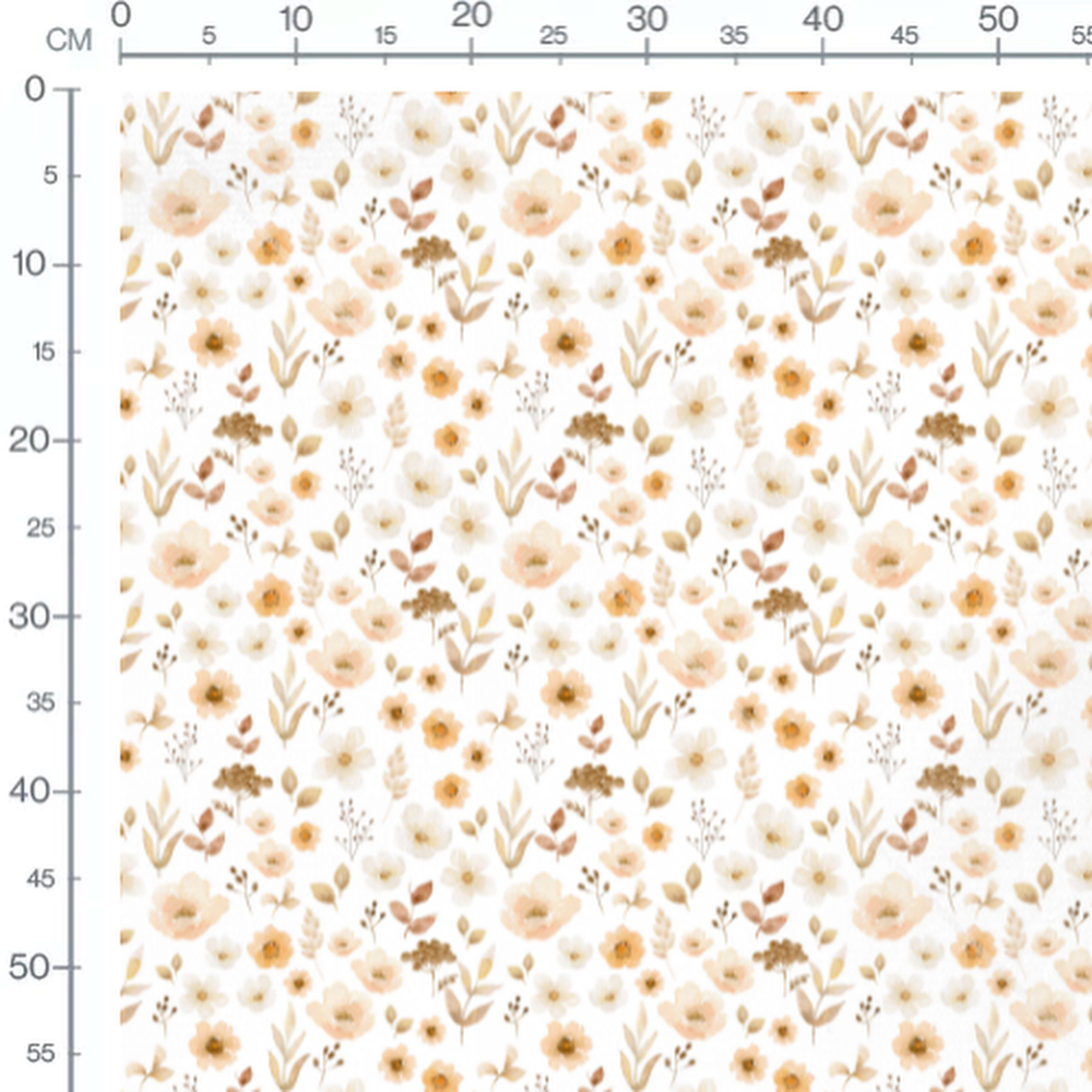 Les fleurs sont de différentes tailles et nuances de beige et marron. Les feuilles et branches complètent le motif avec des teintes similaires. Le fond blanc met en valeur les éléments floraux.Les tissus
