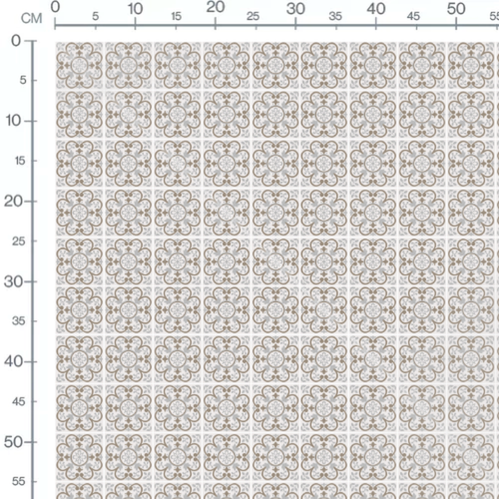 Les motifs floraux sont entourés de formes géométriques beige et gris. Chaque motif est soigneusement répété pour créer un effet harmonieux. Les détails floraux ajoutent une touche élégante au design.Les tissus