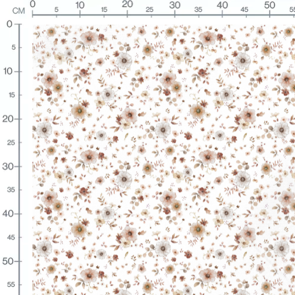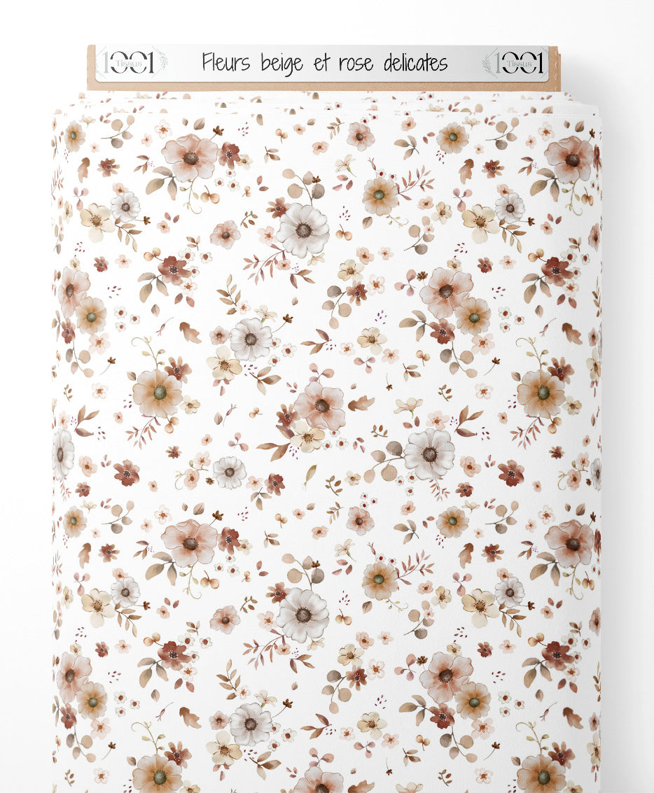 Les grandes fleurs sont entourées de petites fleurs et de feuilles délicates. Les nuances de beige, rose et marron créent une harmonie douce. Les motifs floraux sont variés en taille et en forme.Les tissus