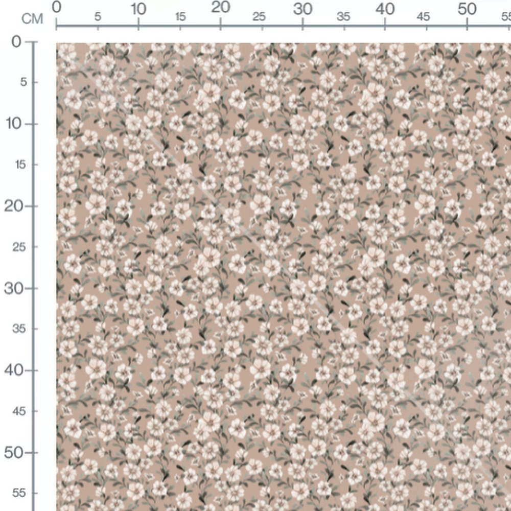 Les fleurs blanches sont entourées de feuilles vertes et de petites branches. Le fond beige met en valeur les détails délicats des fleurs. Les bourgeons ajoutent une touche de finesse au motif floral.Les tissus