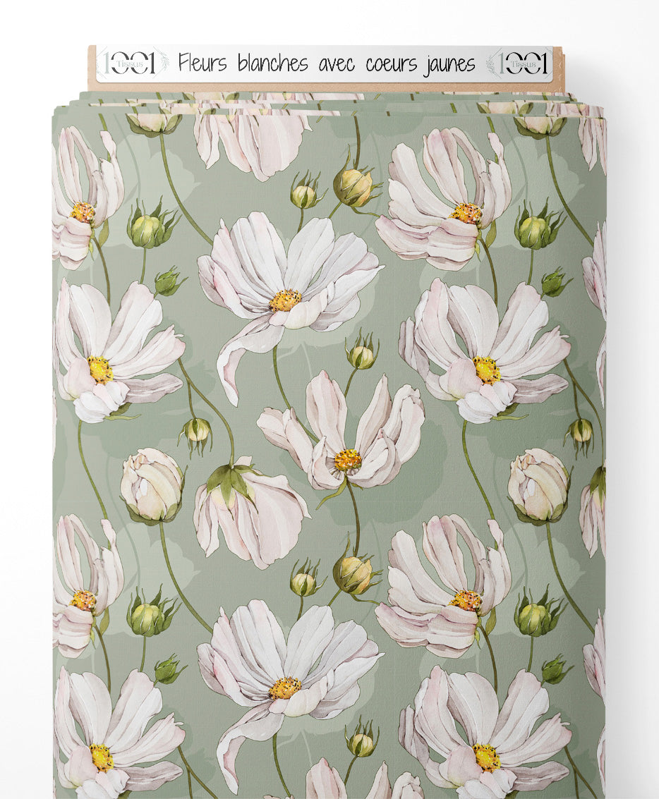Les pétales des fleurs sont délicatement dessinés avec des nuances de blanc et de rose pâle. Les bourgeons verts ajoutent une touche de fraîcheur au motif. Les tiges fines et sinueuses créent un effet de mouvement subtil.Les tissus