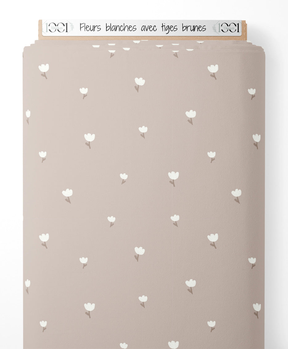 Petites fleurs blanches sur fond beige. Tiges brunes accompagnant chaque fleur.Les tissus