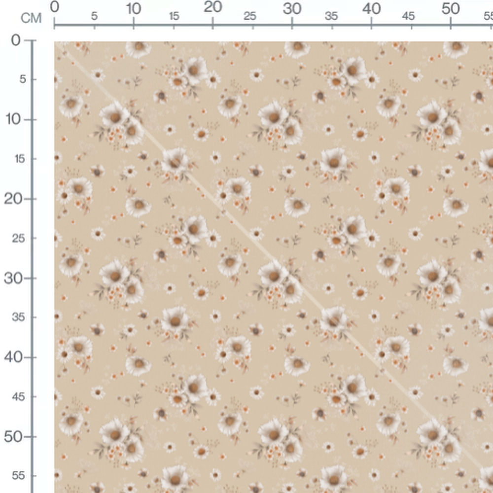 Les fleurs principales sont entourées de petites fleurs blanches. Des feuillages beige et des détails floraux complètent le motif.Les tissus