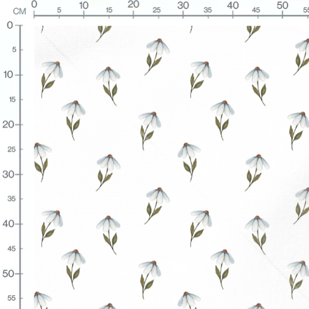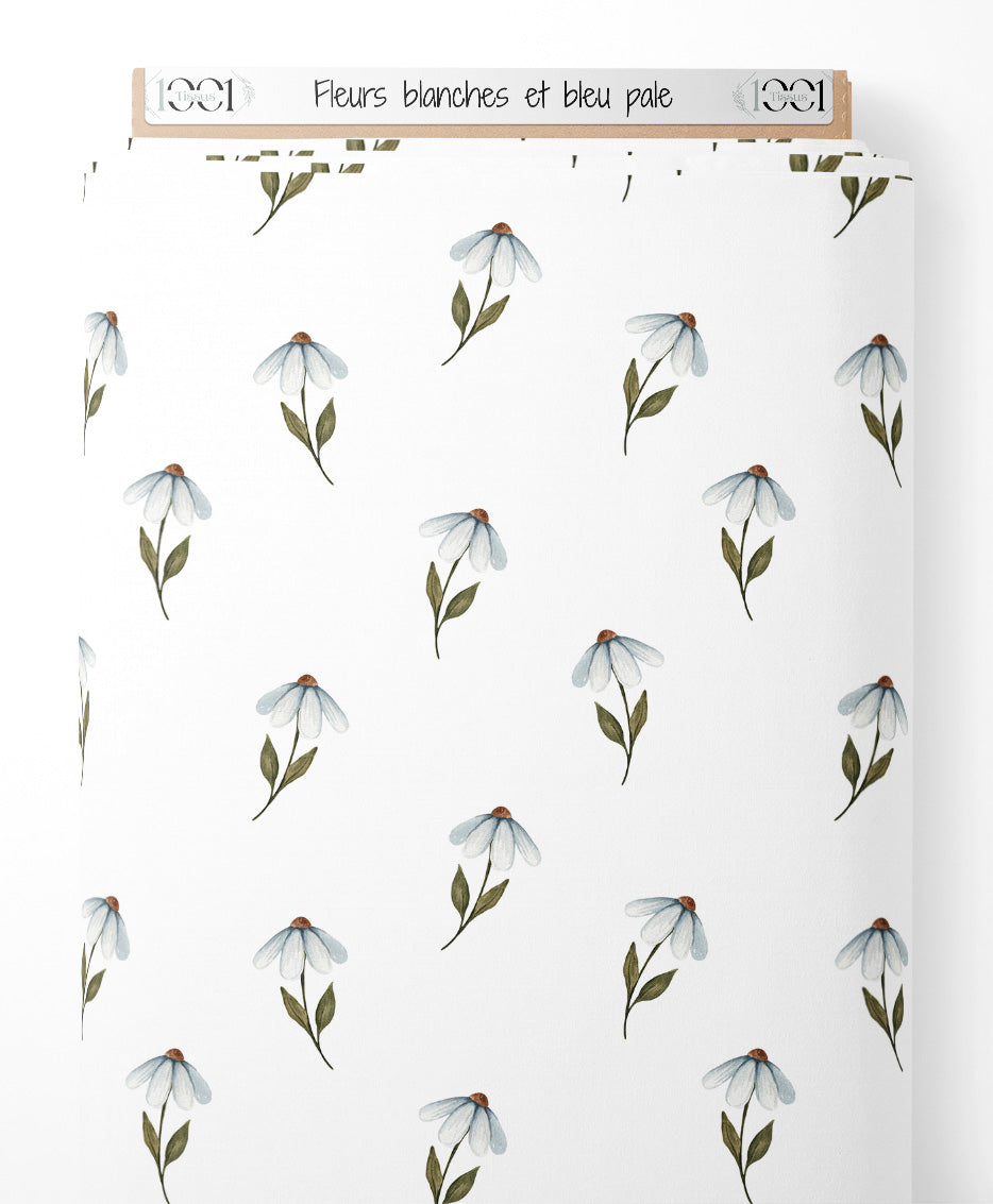Les pétales des fleurs sont délicatement dessinés en bleu pâle. Les feuilles sont d'un vert doux, ajoutant une touche naturelle.Les tissus