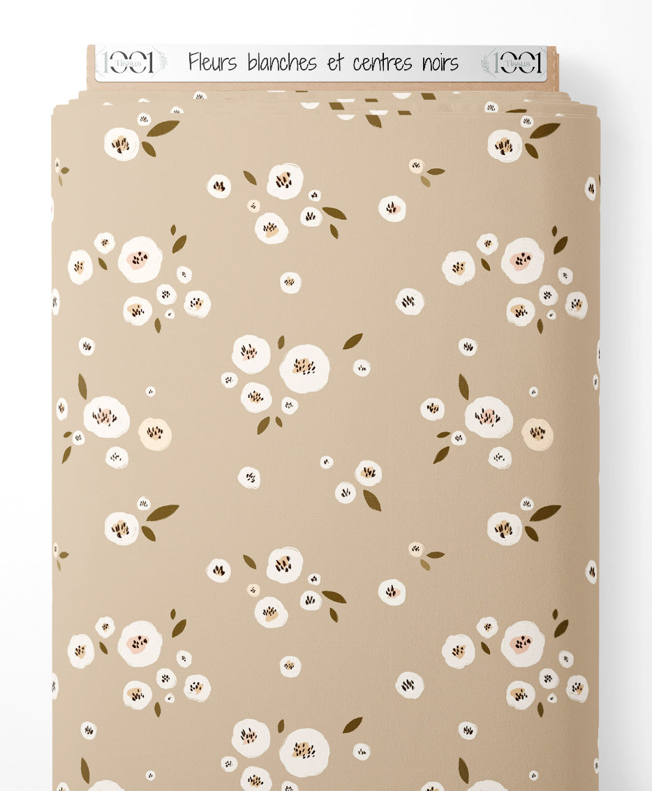 Les fleurs sont de différentes tailles avec des centres noirs distincts. Les feuilles vert olive ajoutent un contraste subtil au fond beige. Les motifs floraux sont espacés uniformément.Les tissus