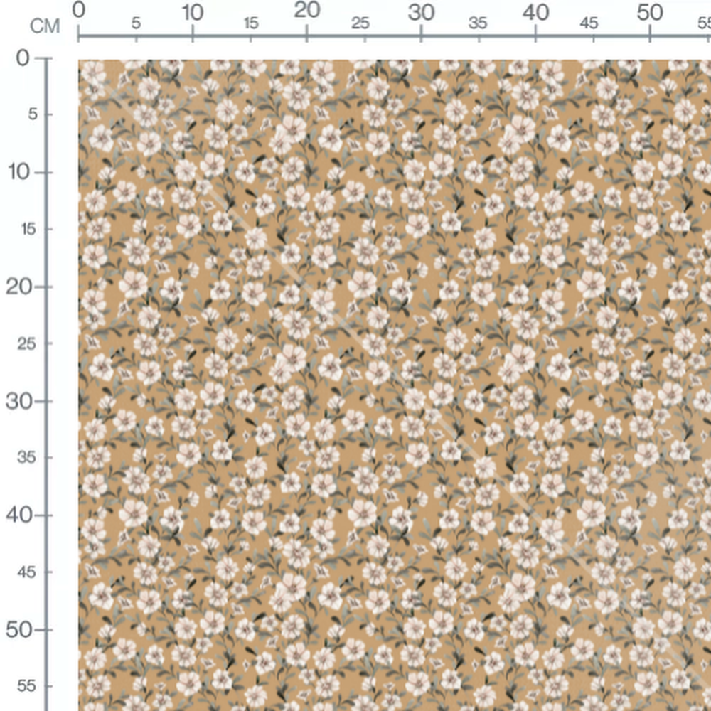 Les fleurs blanches sont entourées de feuilles vertes aux nuances variées. Le fond beige met en valeur la douceur des motifs floraux.Les tissus