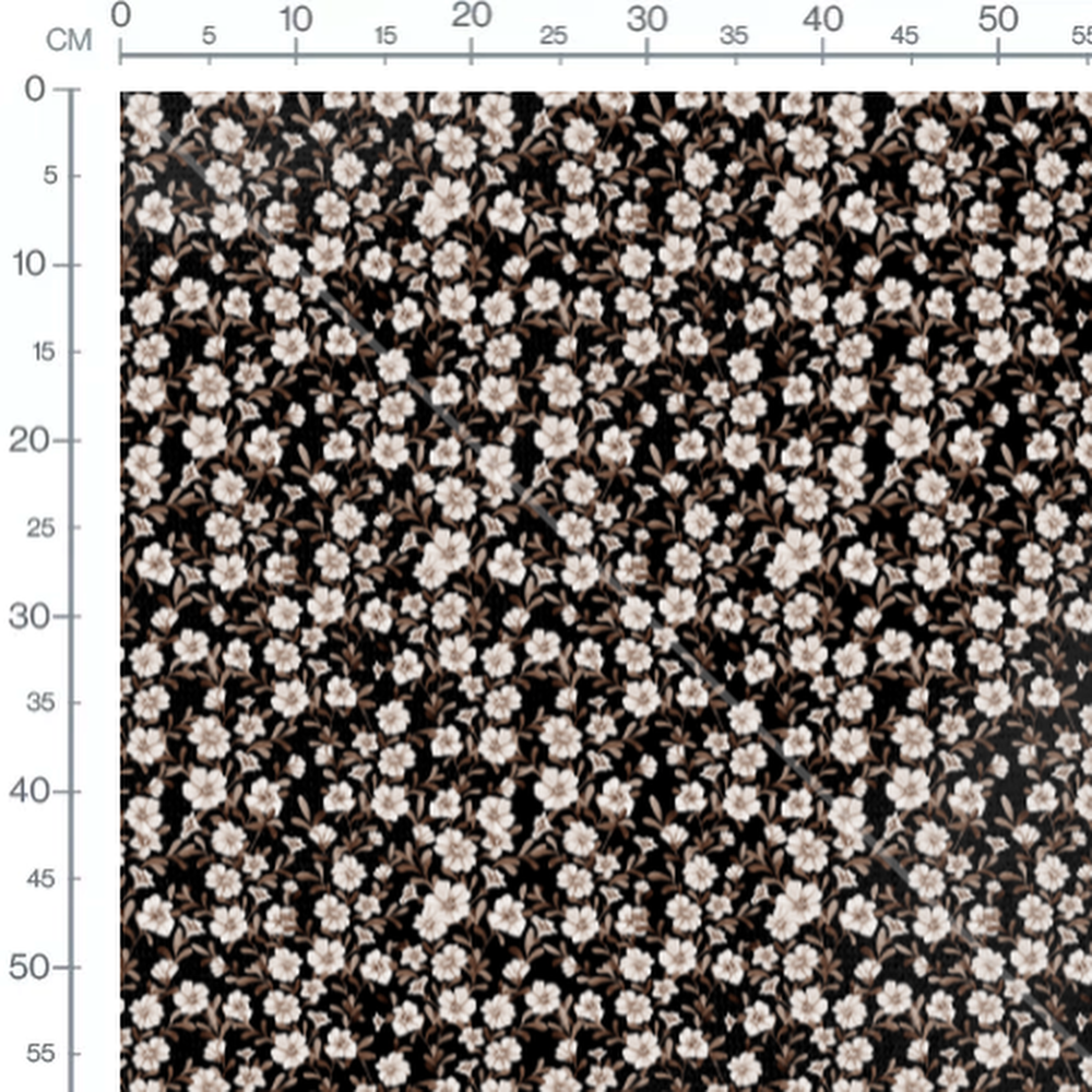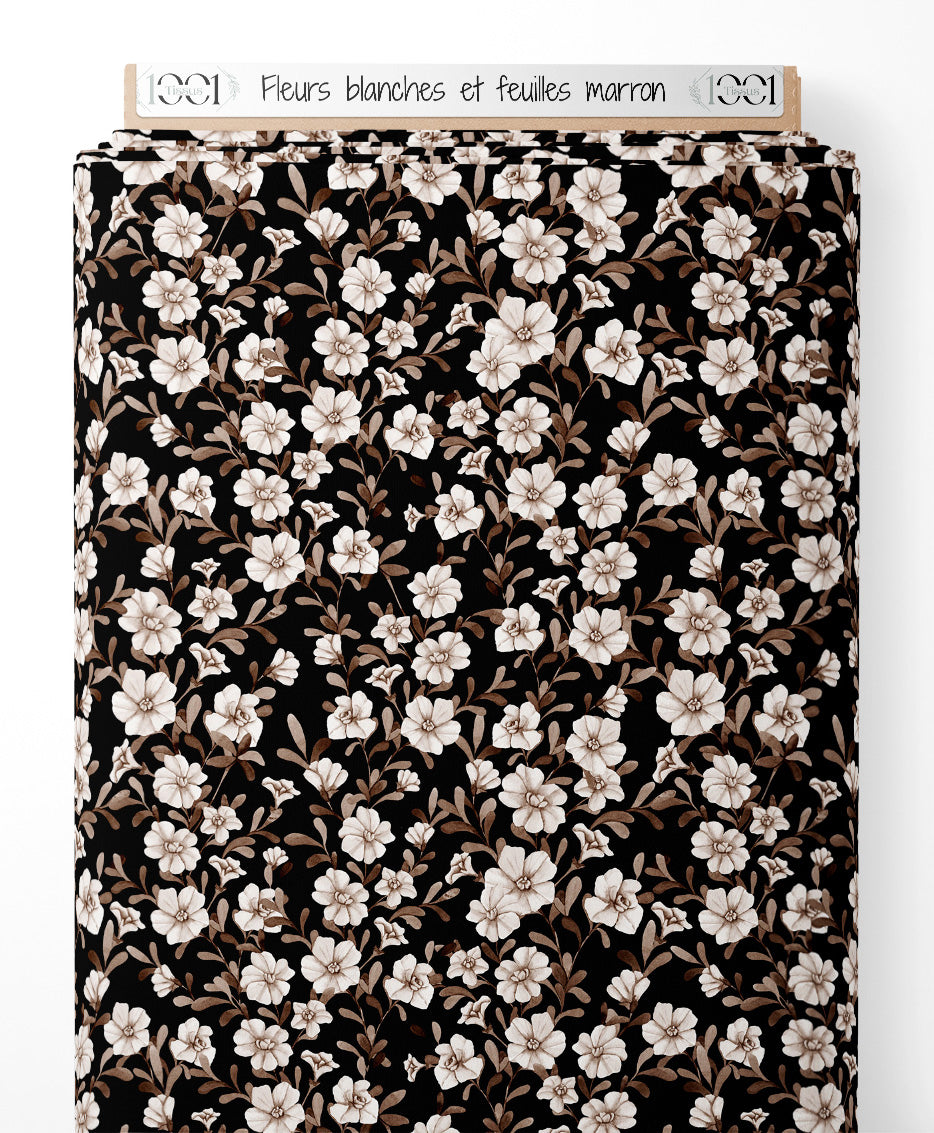 Les fleurs blanches sont détaillées avec des nuances subtiles. Les feuilles marron ajoutent un contraste délicat au fond noir. Le motif est riche et harmonieux, idéal pour un style classique.Les tissus