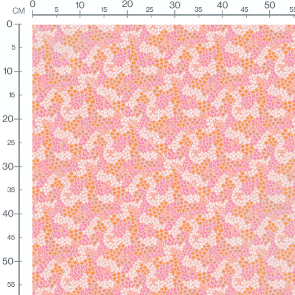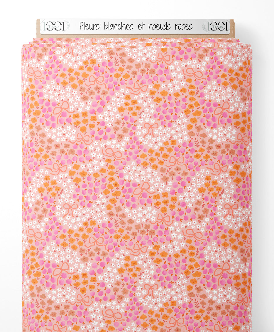 Les fleurs blanches et roses sont entourées de nœuds roses délicats. Des petites feuilles marron et des motifs floraux oranges complètent le design. Le fond rose ajoute une touche douce et harmonieuse.Les tissus