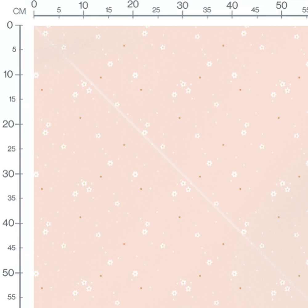 Les fleurs blanches sont délicatement dessinées avec un centre jaune. Le fond rose pâle est parsemé de petits points blancs et bruns, ajoutant une touche subtile au motif.Les tissus