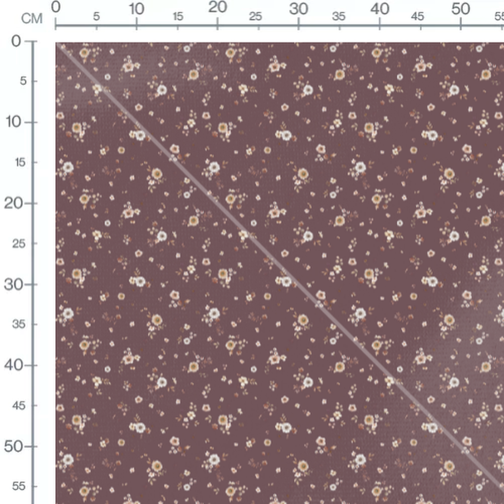 Les fleurs sont entourées de petites feuilles beige. Quelques fleurs sont légèrement rosées avec des nuances marron. Le fond prune met en valeur les motifs floraux délicats.Les tissus