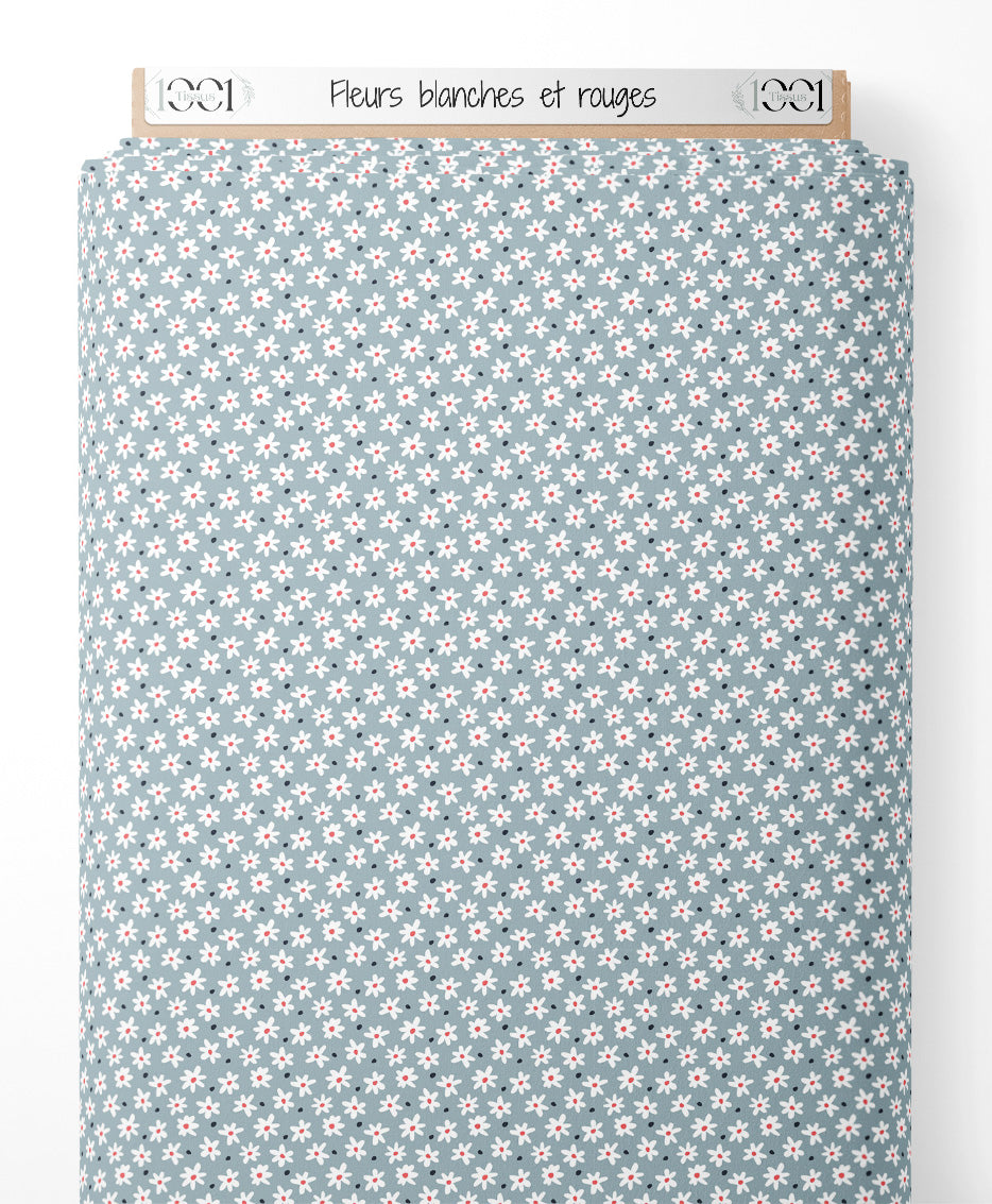 Les fleurs blanches sont dispersées uniformément. Les centres rouges ajoutent une touche de couleur vive. Les petites feuilles grises complètent le motif floral.Les tissus