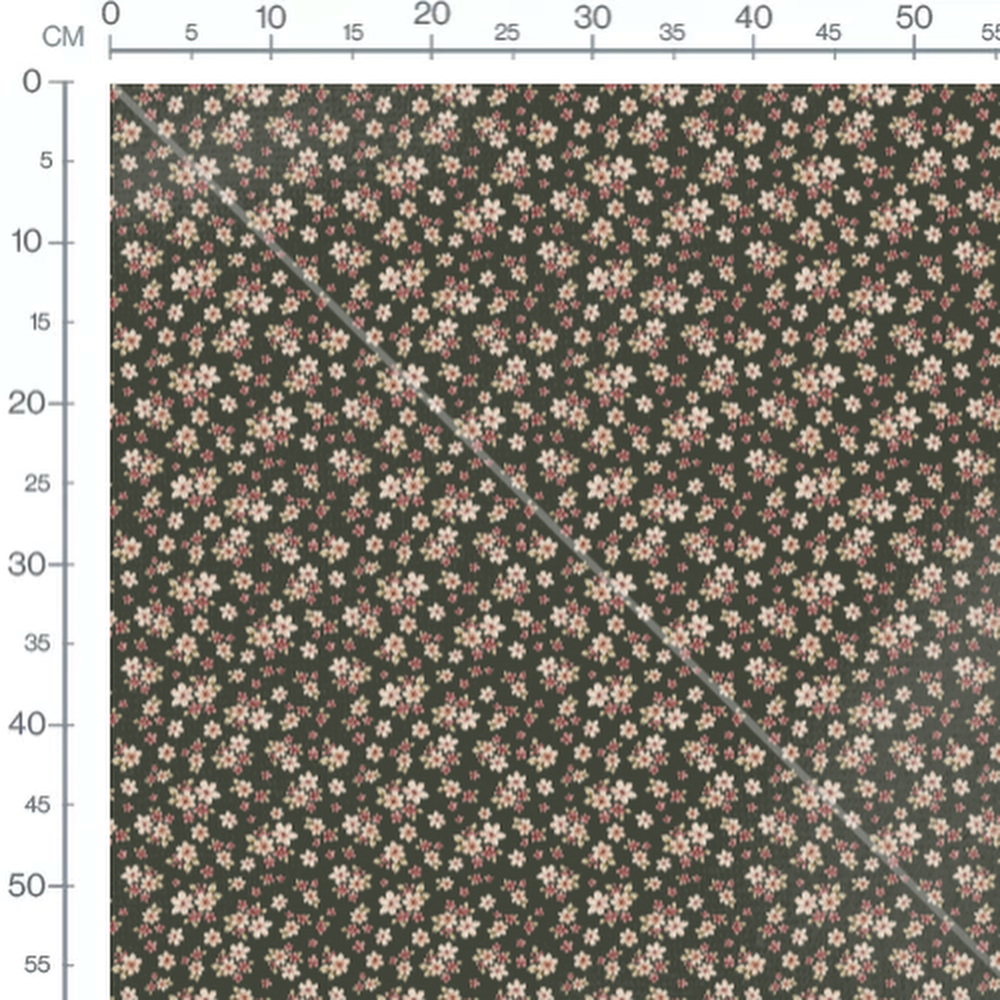 Les fleurs sont uniformément réparties sur le fond. Chaque fleur a un centre détaillé contrastant avec les pétales clairs.Les tissus