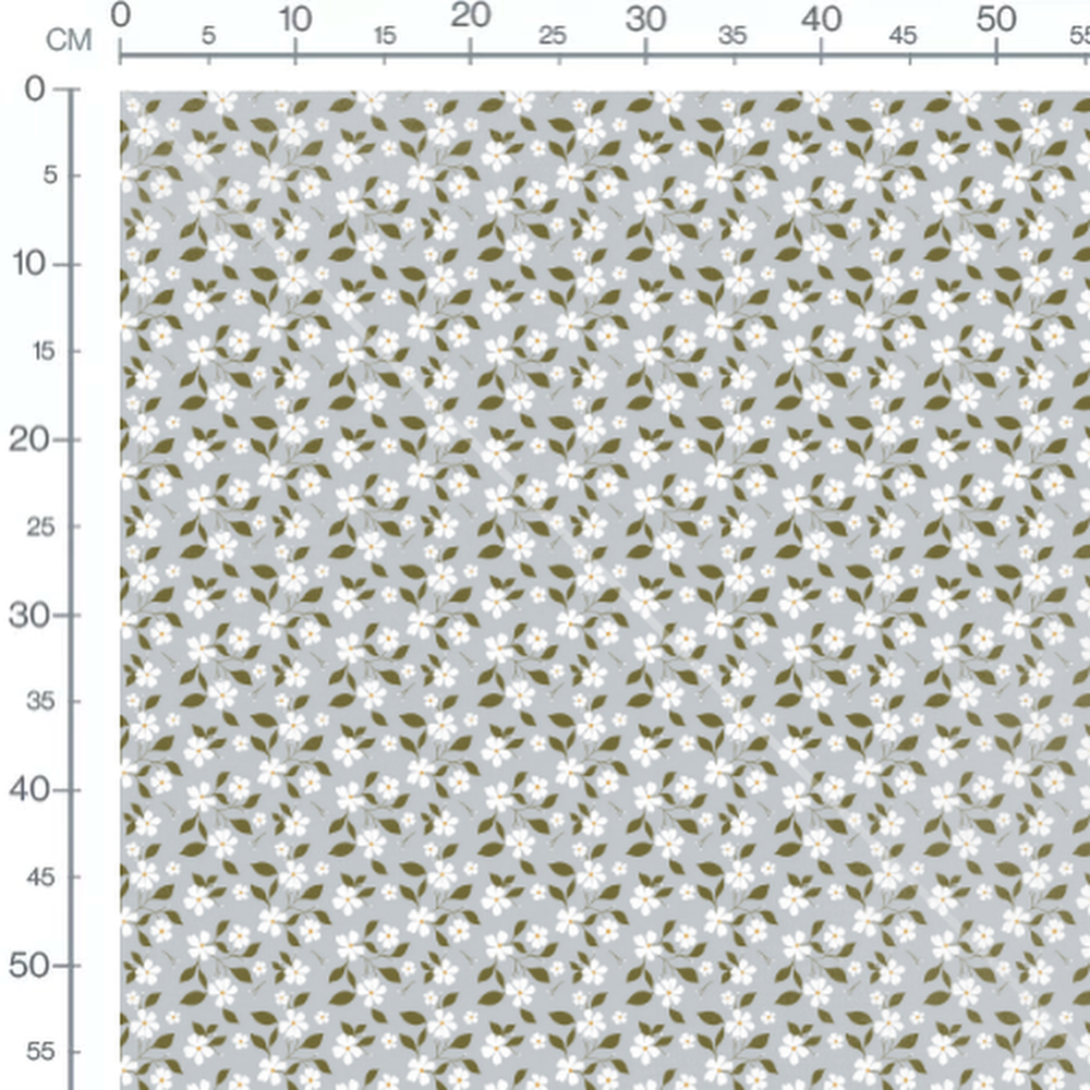 Les fleurs blanches sont accompagnées de petites feuilles vertes. Le fond gris met en valeur les motifs floraux délicats.Les tissus
