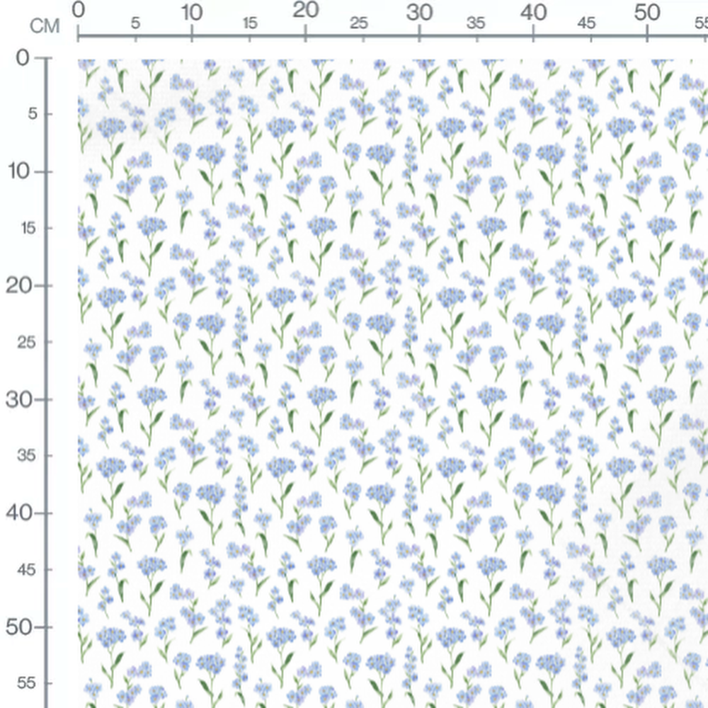 Les fleurs sont de différentes nuances de bleu avec des centres jaunes. Les feuilles sont d'un vert tendre, ajoutant une touche de fraîcheur.Les tissus