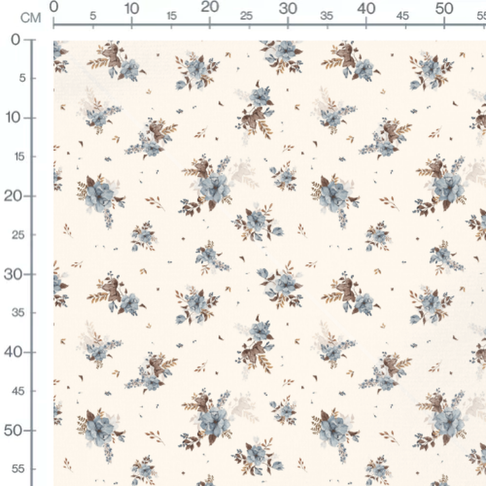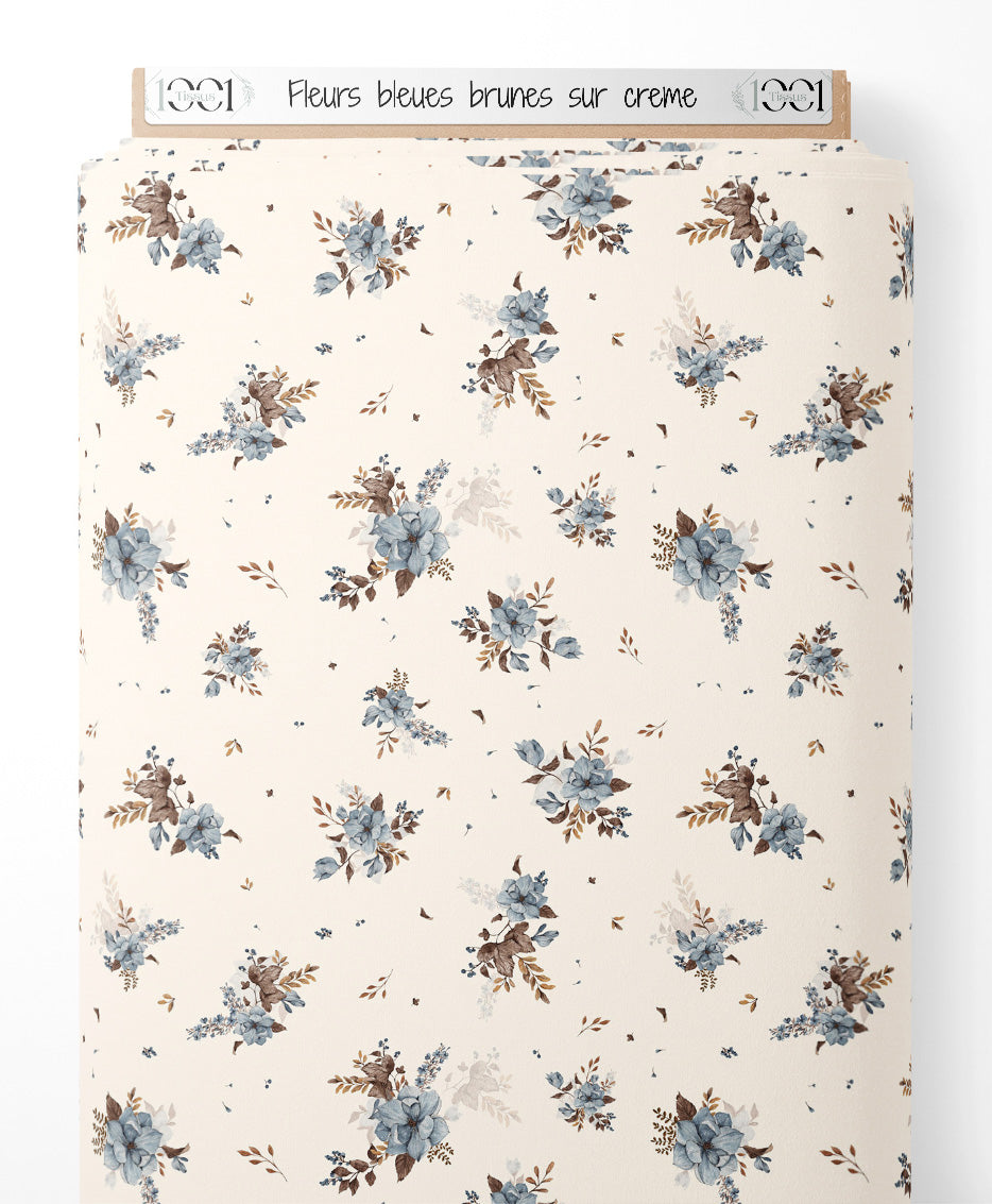 Les fleurs principales sont d'un bleu doux avec des nuances brunes. Des petites feuilles marron et des fleurs plus petites ajoutent de la complexité au motif. Le fond crème met en valeur les couleurs subtiles des fleurs et des feuilles.Les tissus