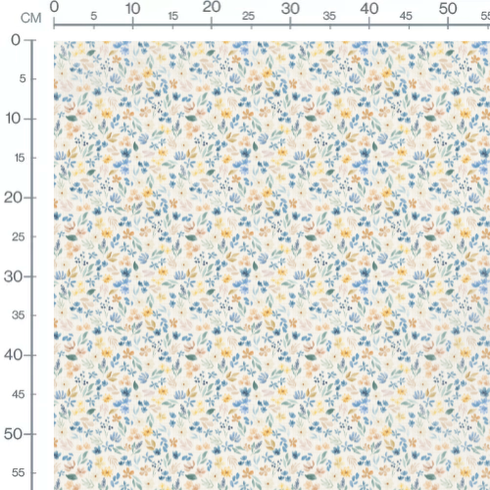 Les fleurs varient en taille et en forme, créant un motif harmonieux. Les teintes aquarelle ajoutent une touche douce et artistique. Les feuilles sont dispersées parmi les fleurs, ajoutant de la texture au motif.Les tissus