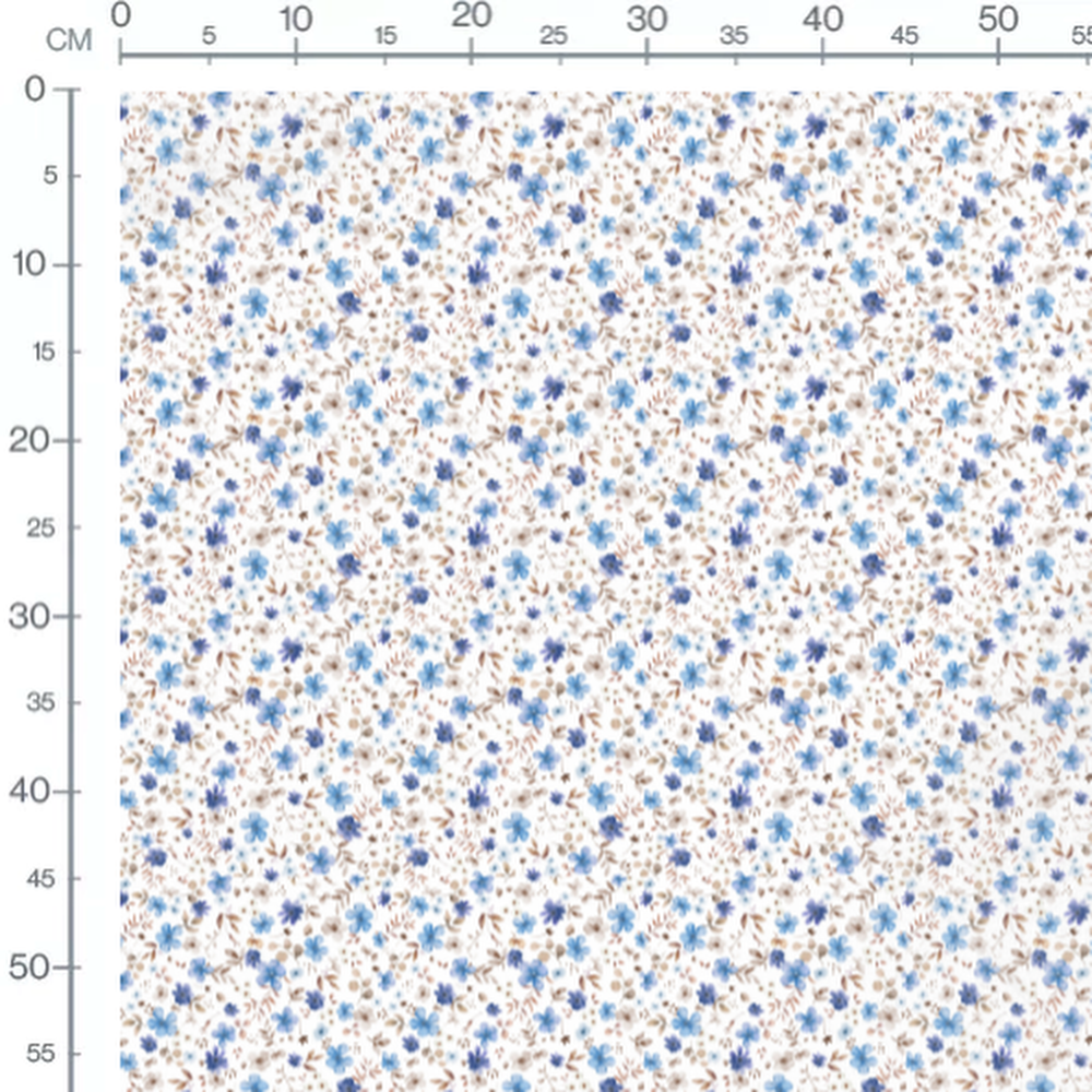 Les fleurs varient en nuances de bleu, allant du clair au foncé. Les feuilles et certaines petites fleurs sont dans des tons bruns doux. Quelques petites fleurs blanches ajoutent de la légèreté au motif.Les tissus