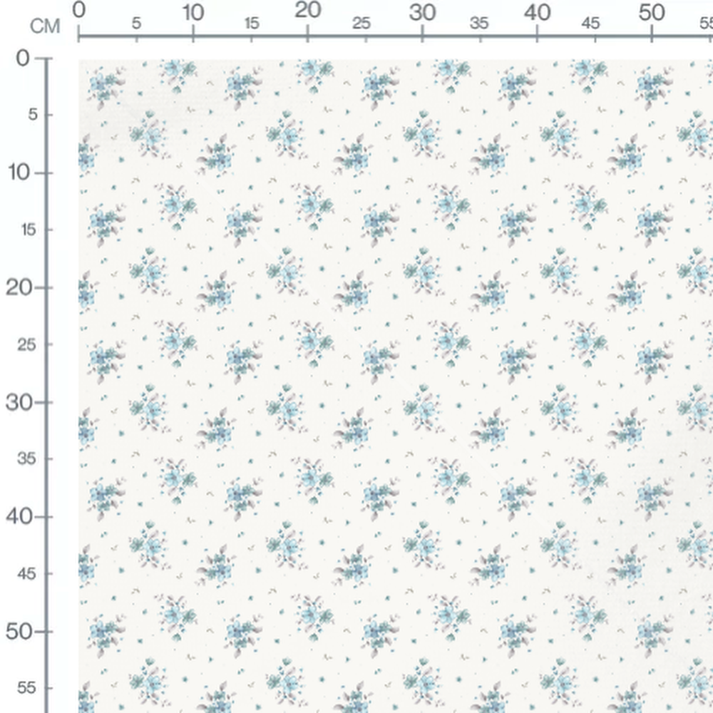 Les fleurs sont de différentes tailles avec des nuances de bleu et de gris. Les petites feuilles vertes et grises ajoutent de la délicatesse au motif. Le fond blanc met en valeur les couleurs douces des fleurs et des feuilles.Les tissus