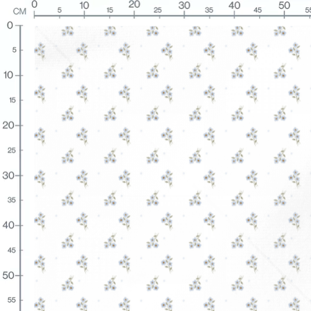 Les fleurs sont regroupées en petits bouquets. Les points gris ajoutent une touche subtile au fond blanc.Les tissus