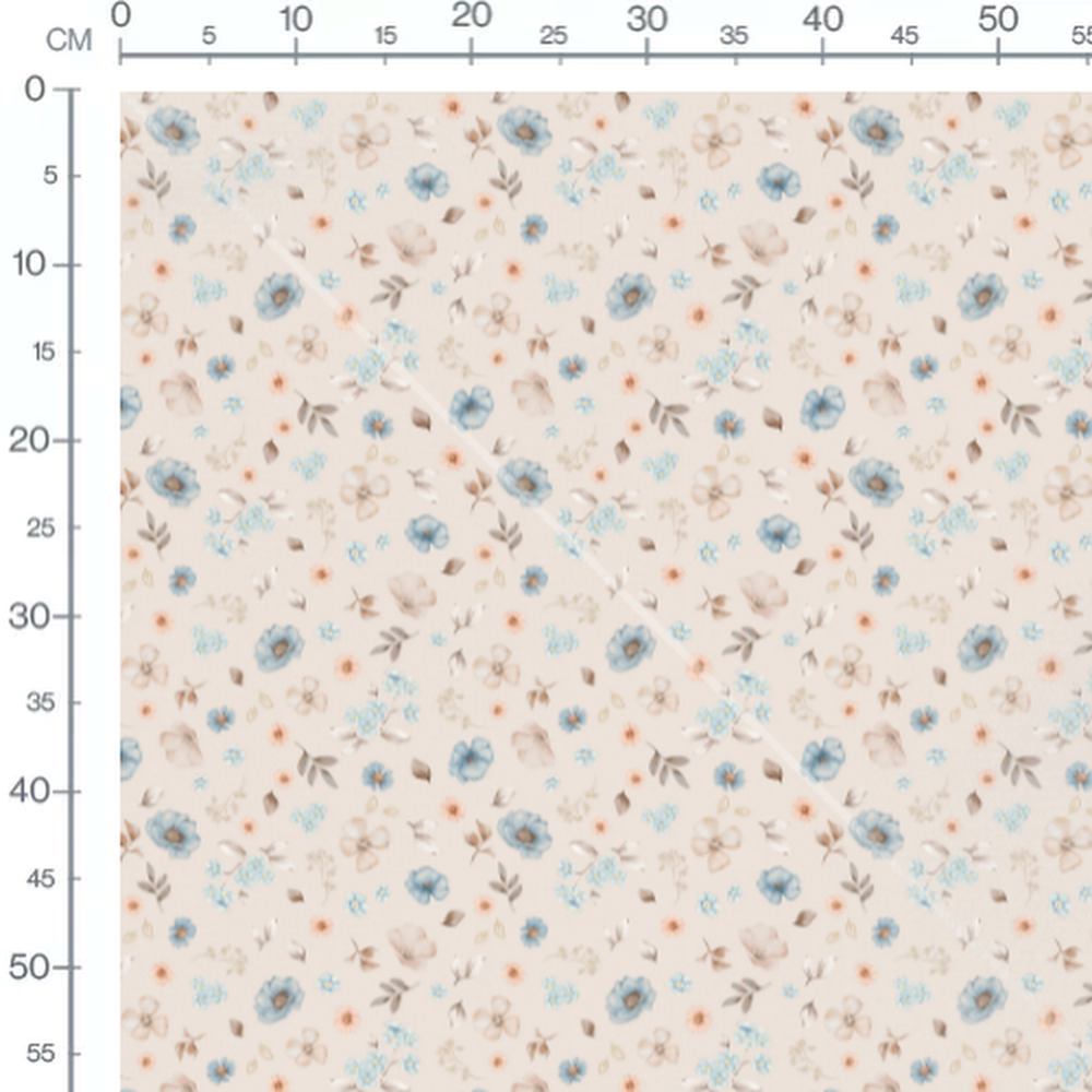 Petites fleurs bleues et roses accompagnées de feuilles marron. Fleurs en aquarelle avec des nuances douces. Fond beige uni mettant en valeur les motifs floraux.Les tissus