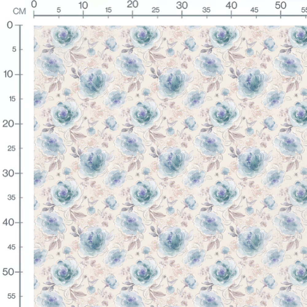 Les grandes fleurs bleues sont accompagnées de touches de violet. De petites fleurs roses ajoutent de la délicatesse au motif. Les feuilles grises complètent l'ensemble floral.Les tissus