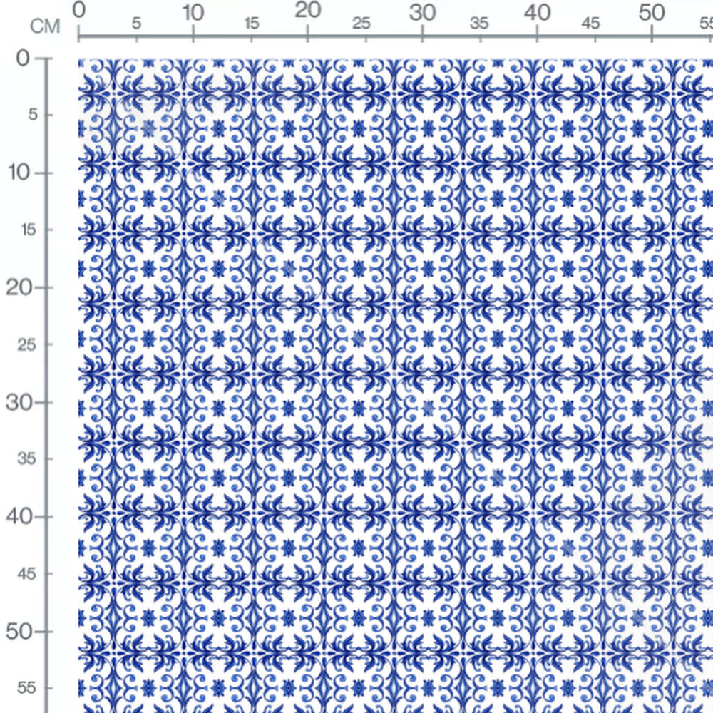 Les motifs floraux sont stylisés avec des courbes élégantes. Le bleu vif contraste avec le fond blanc. Les motifs sont disposés de manière régulière et harmonieuse.Les tissus